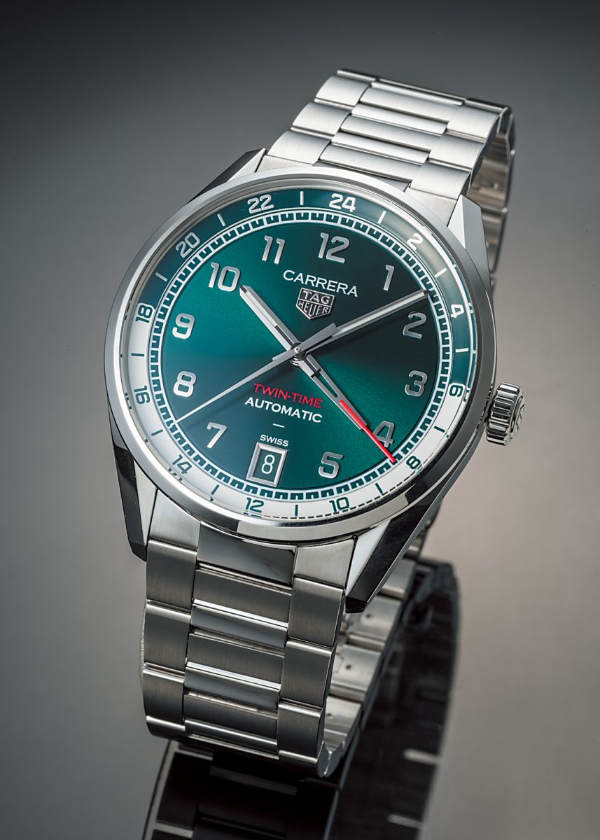 1955年発表のGMTウオッチ「ツインタイム」の系譜を継ぐコレクション。モータースポーツの黄金時代に活躍していたレーシングカーから着想を得たティールカラーの文字盤(サンレイ加工サテン仕上げ)を備える。昼夜で2色分けしたフランジの24時間表示を、先端が赤い24時間針が指して第2時間帯を示す。