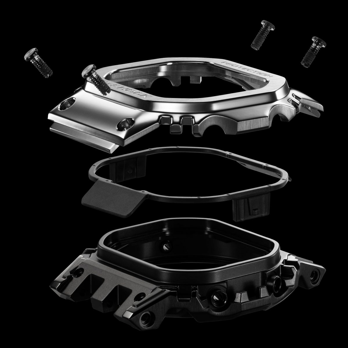 ↑複雑造形のメタルパーツがせめぎ合うように噛み合うためのカギとなるセンターケース。こちらもステンレススチールの塊から削り出された屈強なパーツだ。定番のGMW-B5000はベゼルでセンターケースをフルカバーする構造だが、ベゼルとセンターケースが上下で連結する新開発のアーキテクチャが採用されている。