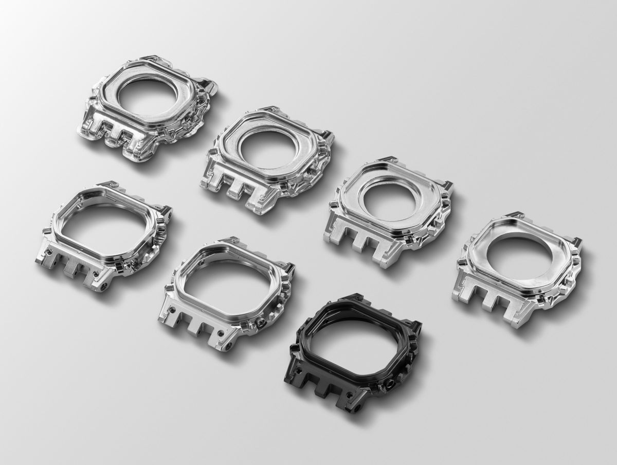 ↑GMW-BZ5000前面カバーベゼル。大きく6つの工程を経て完成へと至る。フロントビスがセットされるベゼルのディンプル部も丁寧に加工されるなど、他の外装パーツを連結する機能も有している。
