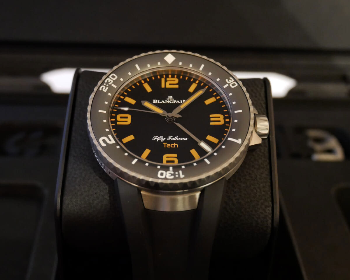↑ブランパン「フィフティ ファゾムス テック」 Ref.5029-12B30-94A 315万7000円/自動巻き(Cal.1315A)、毎時2万8800振動、120時間パワーリザーブ。グレード23チタンケース(シースルーバック)、ブラックラバーストラップ(交換用ラバーストラップが2本付属)、サファイアクリスタルベゼル。直径45mm、厚さ14.10mm