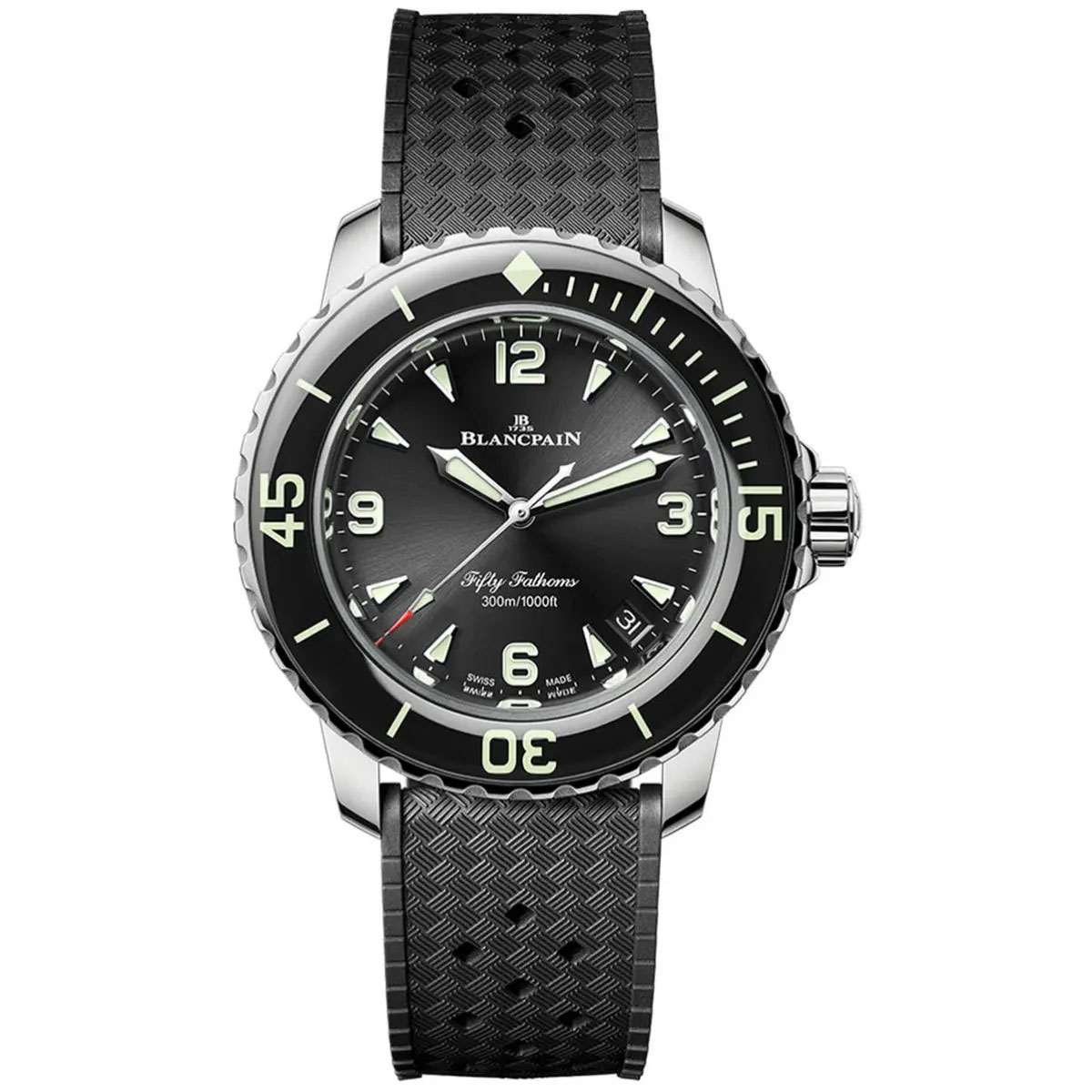 ↑ブランパン「フィフティ ファゾムス オートマティック(38mm径モデル)」 Ref.5007-1130-B64A 233万2000円/自動巻き(Cal.1150)、毎時2万1600振動、100時間パワーリザーブ。ステンレススチールケース(シースルーバック)、ラバーストラップ、サファイアクリスタルベゼル。直径38.2mm、厚さ12mm。30気圧防水