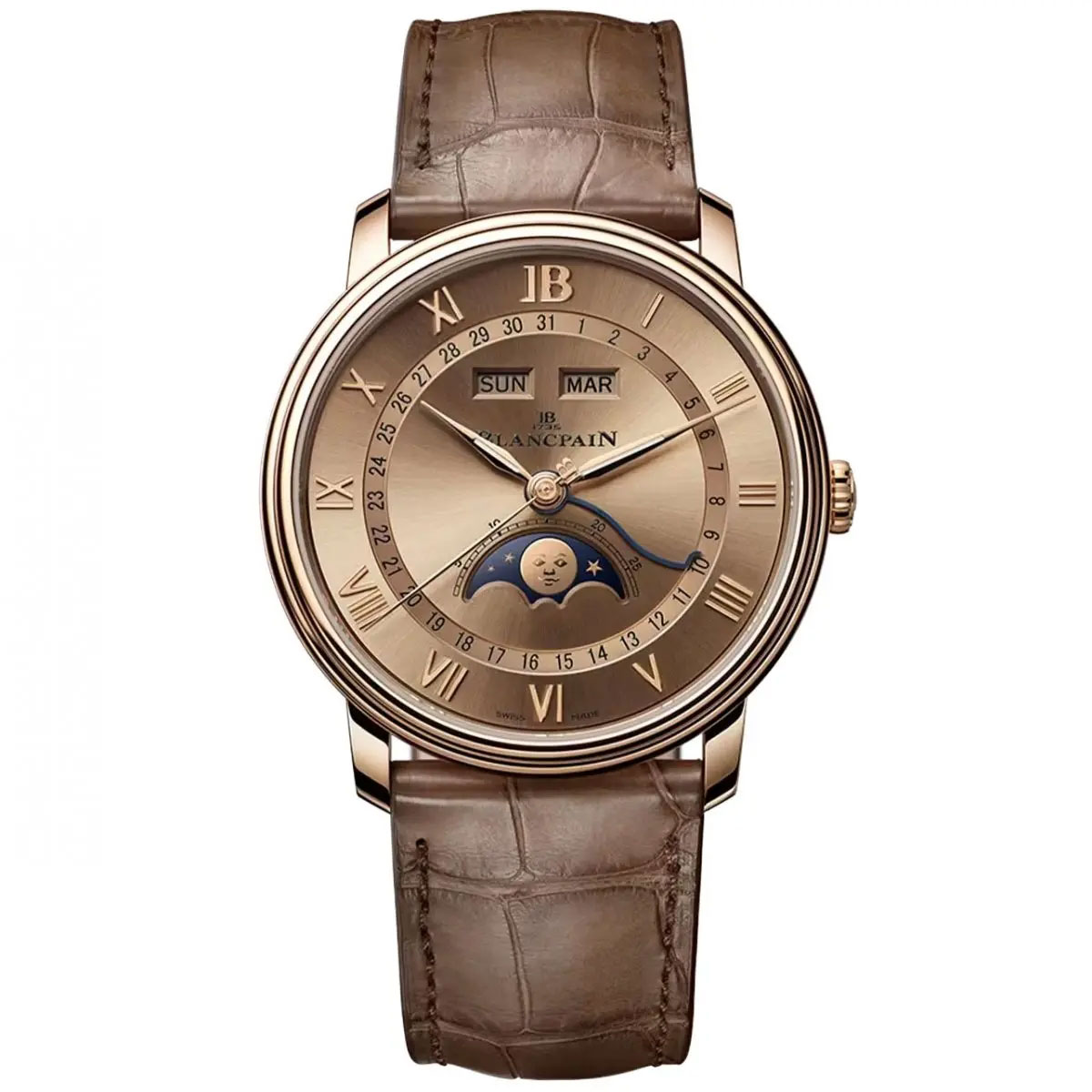 ↑ブランパン「ヴィルレ コンプリートカレンダー」 Ref.6654N-3646-55B 452万1000円/自動巻き(自社製Cal.6654.4)、毎時2万8800振動、72時間パワーリザーブ。18Kレッドゴールドケース(シースルーバック)、アリゲーターストラップ。直径40.20mm、厚さ10.60mm。3気圧防水