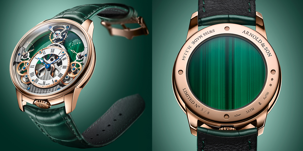 アーノルド&サン「タイムピラミッド 42.5 マラカイト エディション」Ref.1TPER.F01A.C1250A、日本発売未定 手巻き(キャリバーA&S1615)、毎時2万1600振動、90時間パワーリザーブ。18Kレッドゴールドケース。直径42.5mm、厚さ10.72mm。アリゲーターストラップ。3気圧防水。世界限定8本。(同時発表のプラチナ仕様も世界限定8本、Ref.1TPEX.F01A.C1250X)