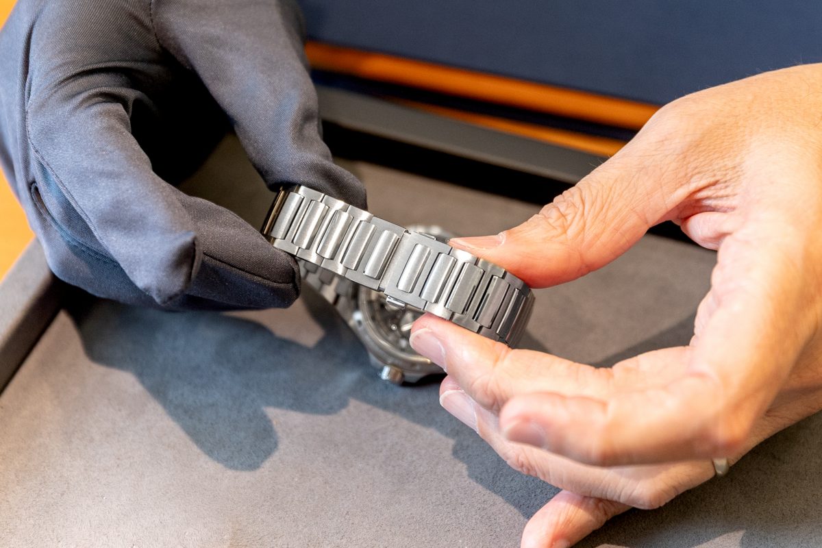 ロンジチュードのバンドはインターチェンジャブルタイプにつき、工具不要でストラップの付け替えが可能。ブレスレットはエクステンション構造が組み込まれている。