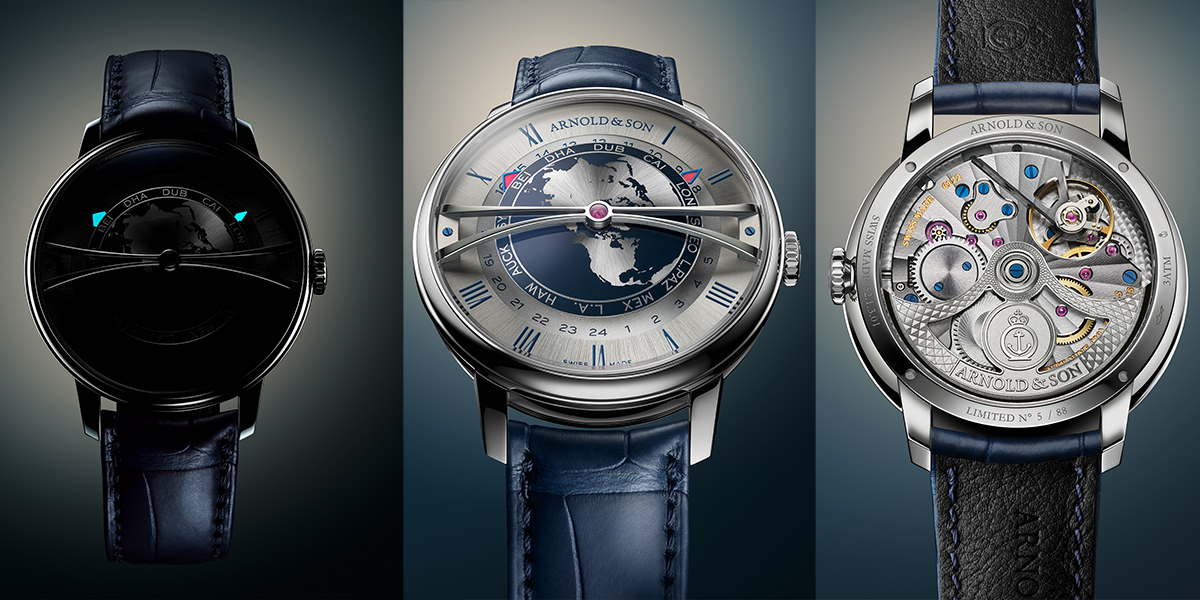 アーノルド&サン「グローブトロッター スチール、ストランドブルー エディション」Ref.1WTBS.K01A.C0263S/341万円 自動巻き(キャリバーA&S6122)、毎時2万8800振動、55時間パワーリザーブ。ステンレススティールケース(シースルーバック)。直径42mm、厚さ15.10mm(アーチ部分含む)。アリゲーターストラップ。3気圧防水。世界限定88本。