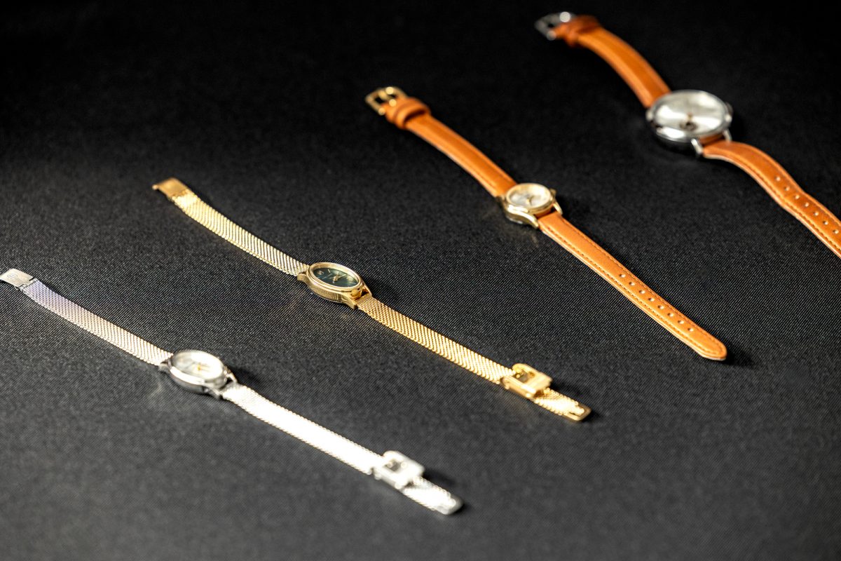 ローラさんが見せてくれた最新の小径ウオッチ。左のブレスレットタイプはラグ幅8mm、その隣のレザータイプの1本は10mm幅。