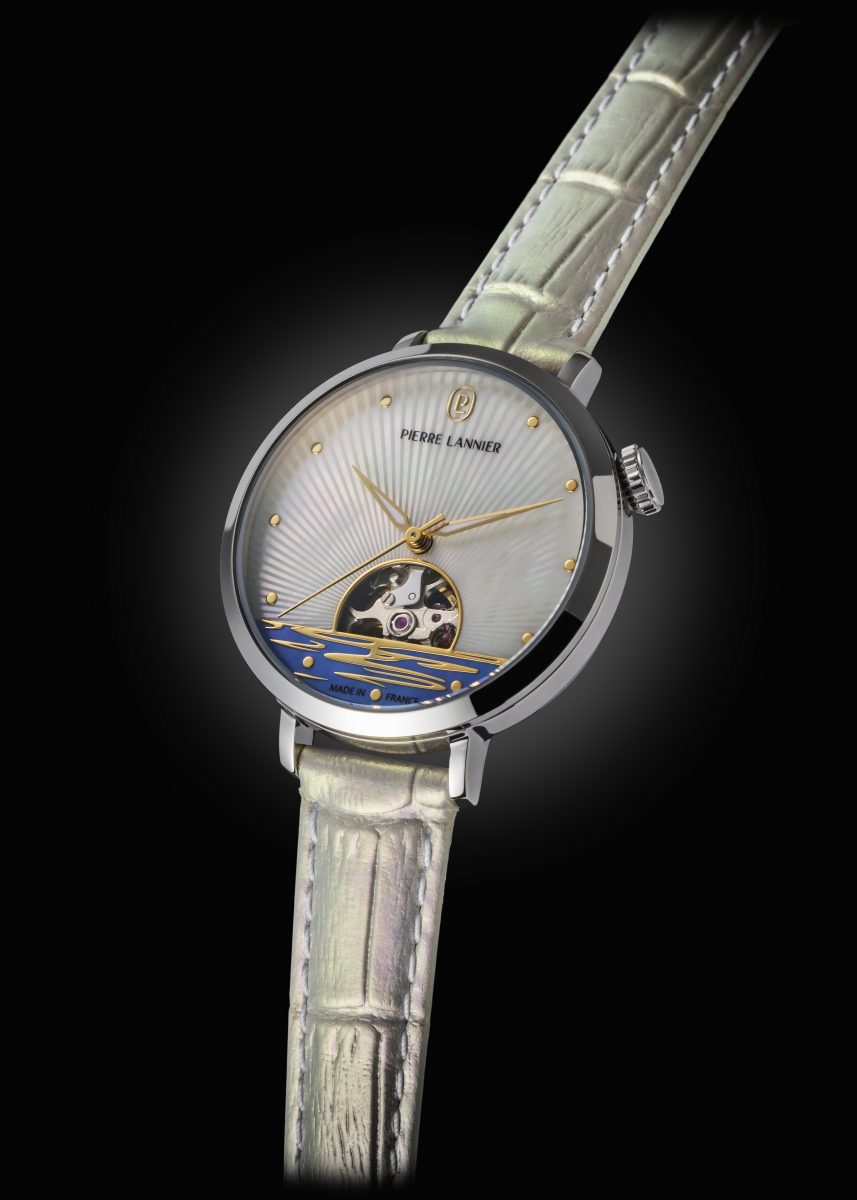 数多くあるピエール・ラニエのラインナップの中でも筆者がとくに気に入った一本。水平線から顔をのぞかせるテンプを太陽に見立て、そこから放たれる光を海面の金色と放射パターンの入ったマザーオブパールの盤面で表現。レディスウオッチには丸で囲んだロゴを使うのだという。オーロラ仕上げのレザーストラップとも相性抜群。「オーストレイル」Ref.P150H900 5万2800円 自動巻き。直径35mm、厚さ13mm。3気圧防水