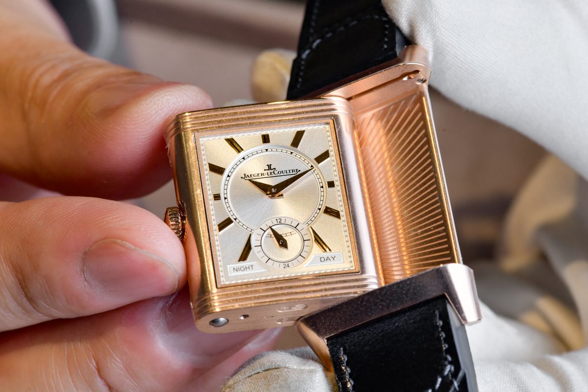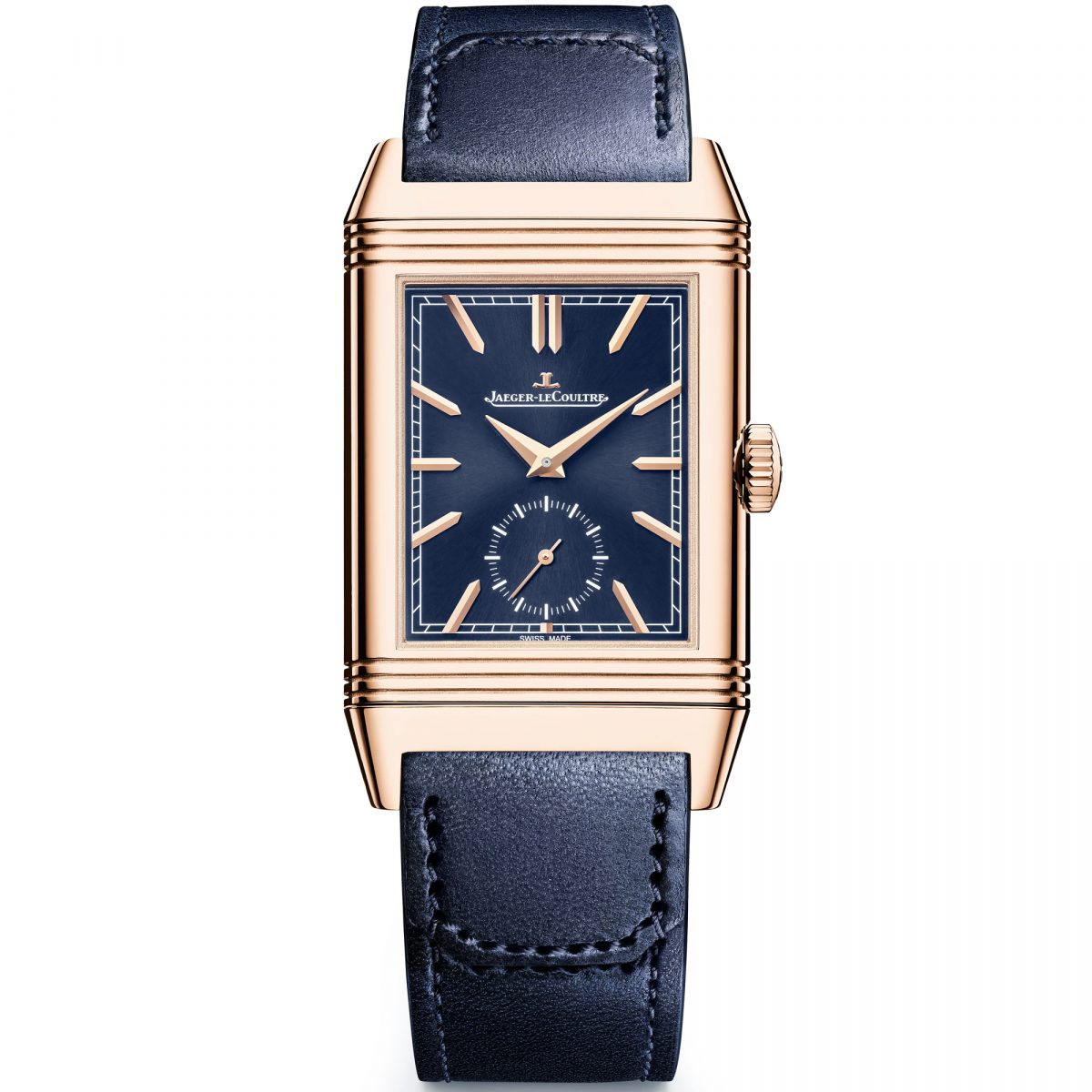 ジャガー・ルクルト「レベルソ・トリビュート デュオ・スモールセコンド」 Ref.Q3982590 448万8000円/手巻き(Cal.854)、毎時2万1600振動、約42時間パワーリザーブ。ピンクゴールドケース、カーフストラップ。縦47×横28.3mm、厚さ9.613mm。3気圧防水。