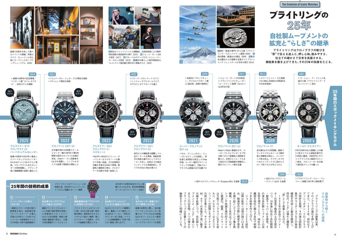 松山 猛氏と名畑政治氏が時計と文化を尋ねて各地を巡る「風来旅日記」や世界視点での時計トレンドを分析する「Chrono24 グローバル動向2025年レポート」など連載記事は今回も興味深いトピックスを掲載。高橋和幸カメラマンによる連載「ウオッチのWA!!!!!!」には現在の卓球人気の礎を築いた“愛ちゃん”こと福原 愛さんが出演しています。