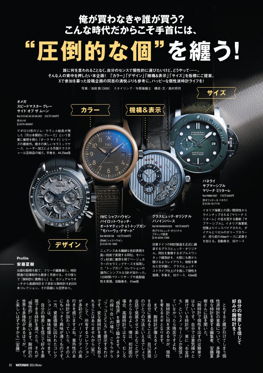 人気連載「レディスウオッチ通信」は、6ページの拡大版で最新事情をテーマ別にご案内。現行モデルのなかでも豊かな個性を持つ腕時計を、個性派ウオッチを愛する「X」ユーザーこだわりの一本とともに紹介する「“圧倒的な個”を纏う!」や、WATCHNAVIらしいアフターケア指南企画「腕時計“開運”徹底洗浄術」など、時計情報盛りだくさん!