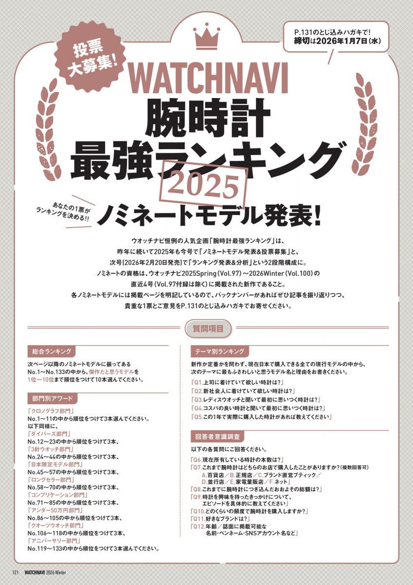 「腕時計最強ランキング2025-26」今年も実施決定!!
