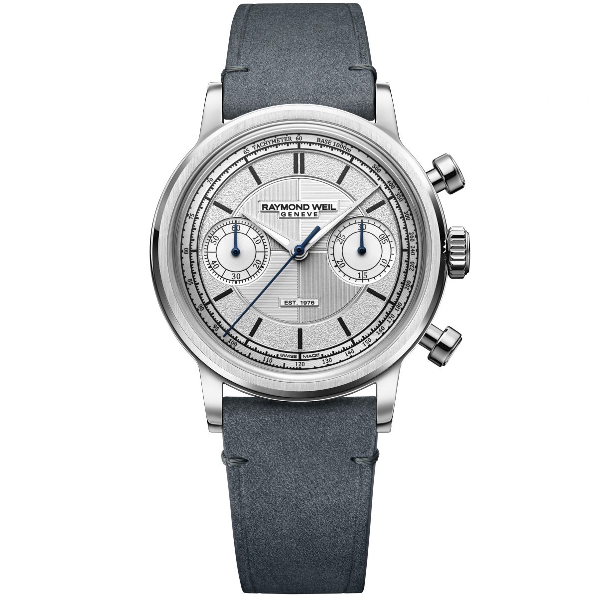 外装も往年のクロノグラフを想起させる端正な仕上がりを特徴とし、直径37mm、厚さ10.75mmという控えめながら存在感のあるステンレススチールケースには、18Kホワイトゴールド製のベゼルを装備。シルバーカラーのダイアルは、中央部、アワートラック、ミニッツトラック、スモールセコンドと30分積算計を備えるインダイアルの4つのパーツで緻密に構成され、ダイアル中央には縦横の筋目を切り替えたタペストリーモチーフをデザイン。わずかに隆起したブランドロゴと「EST. 1976」の刻印が、表情にアクセントをもたらしている。また、アワートラックのグレイン仕上げやミニッツトラックのスネイル仕上げなど、各部位に異なる装飾を施すことで質感のコントラストを際立たせ、ネオ・ヴィンテージの美学と高い視認性を両立させた。