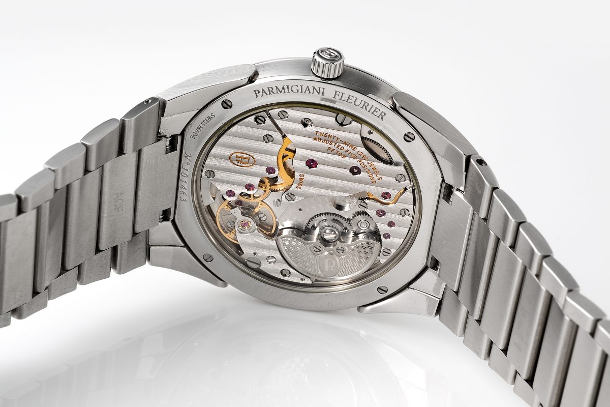 なお、パルミジャーニ・フルリエの「トンダ PF」ステンレススチールモデルはベゼルにプラチナを採用。ムーブメントに使用しているローターもプラチナ製、あるいは22Kゴールド製であるほか、アプライドインデックスもまた、ロジウムプレート加工を施した18Kゴールドを使用するなど、高品位な素材使いに抜かりはない。こうした素材使いからも、控えめながらスイス高級時計作りの本質を突いている。