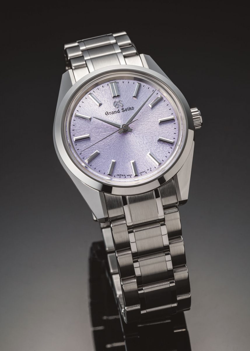 1967年の「44GS」が確立したGSスタイルを踏襲し、モダンな解釈を加えた「44GS現代デザイン」の最新作は、象徴的な岩手山パターンを施した文字盤を、南部の紫桐に由来する柔らかなパープルカラーに仕上げた一本。程よいサイズとも調和している。