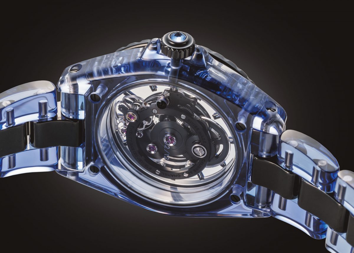 1600時間以上もの作業を経てサファイアクリスタルのブロックから名機の形へと磨き上げた外装に、自社製「キャリバー3.1」を搭載。18Kホワイトゴールドをブラックに仕上げたベゼルやブレスには、合計196個のバゲットカットの天然ブルーサファイアをセット。