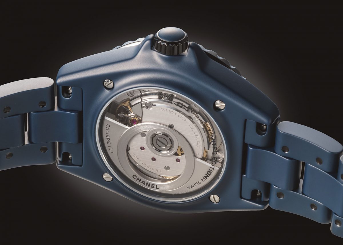 (右)シャネル「J12 BLEU キャリバー 12.1, 38MM」 Ref.H9632 178万2000円/自動巻き(Cal. 12.1)、高耐性セラミック+ステンレススチールケース(シースルーバック)&ブレスレット。直径38mm、厚さ12.6mm。200m防水。