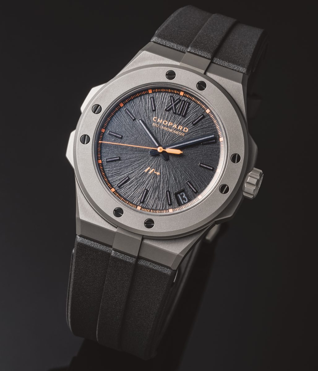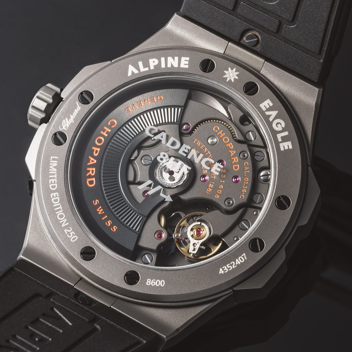 スペック:自動巻き(Cal.Chopard 01.14-C)、毎時5万7600振動、約60時間パワーリザーブ。セラミック加工チタンケース(シースルーバック)、ラバーストラップ。直径41mm、厚さ9.75mm。100m防水。