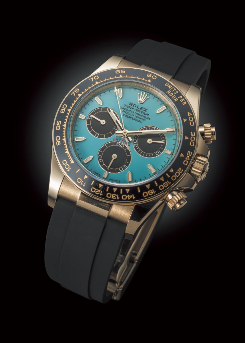 名作クロノグラフにターコイズブルーラッカーダイアルを初採用。ブライトブラックのカウンターやタキメーター入りのブラックセラクロムベゼルなど、黒と金の組み合わせの中でコントラストが映える一本に仕上げた。インデックスにはクロマライト ディスプレイを備え、暗所での視認性も確保している。