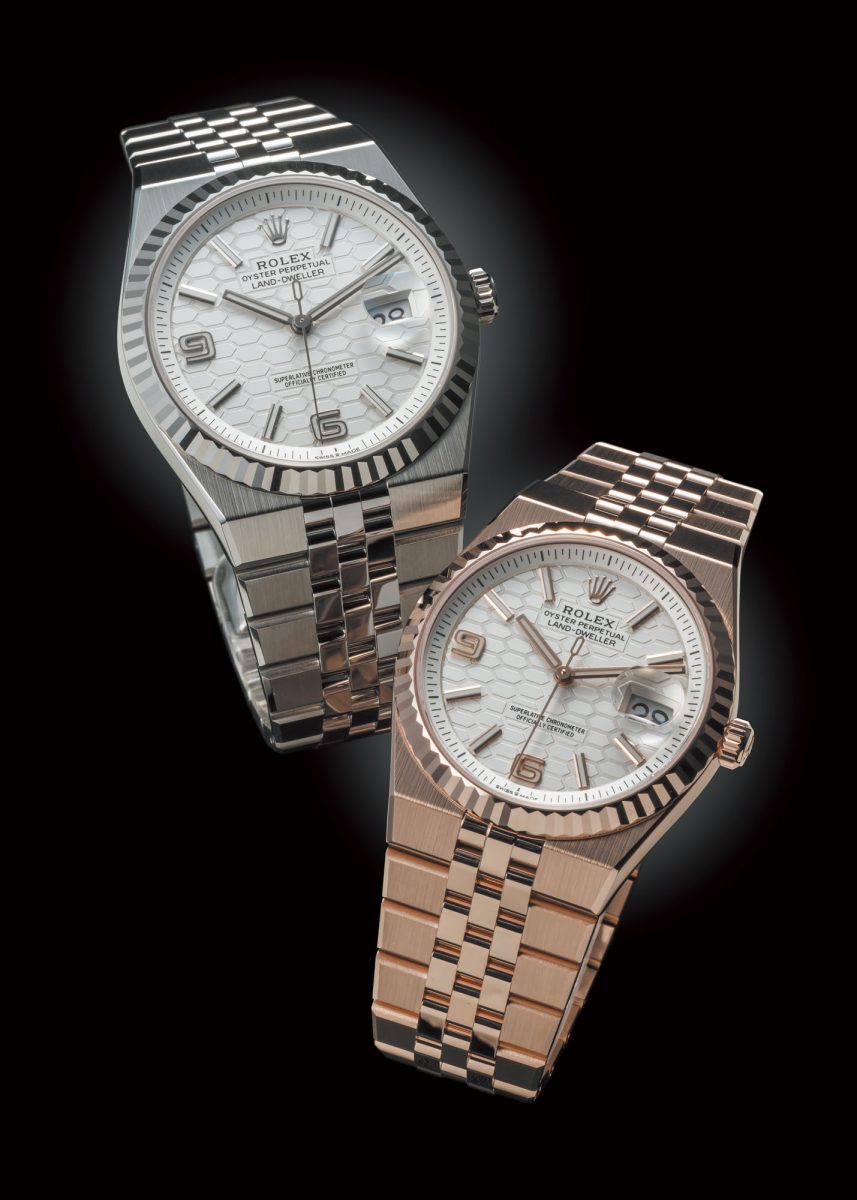 フェムト秒レーザー技術で切断・エッチングされたハニカム(蜂の巣)構造のダイアルは、光の当たり方で表情を変える立体的なサテン仕上げ。2サイズ展開で、いずれも「ダイナパルス脱進機」採用のロレックス完全自社製造の最新ムーブメント「キャリバー7135」を搭載する。「フラットジュビリーブレスレット」は、ドレッシーな雰囲気を残しつつ、コマがフラットになることで肌への密着度が増してスポーツモデルのような装着感を実現。