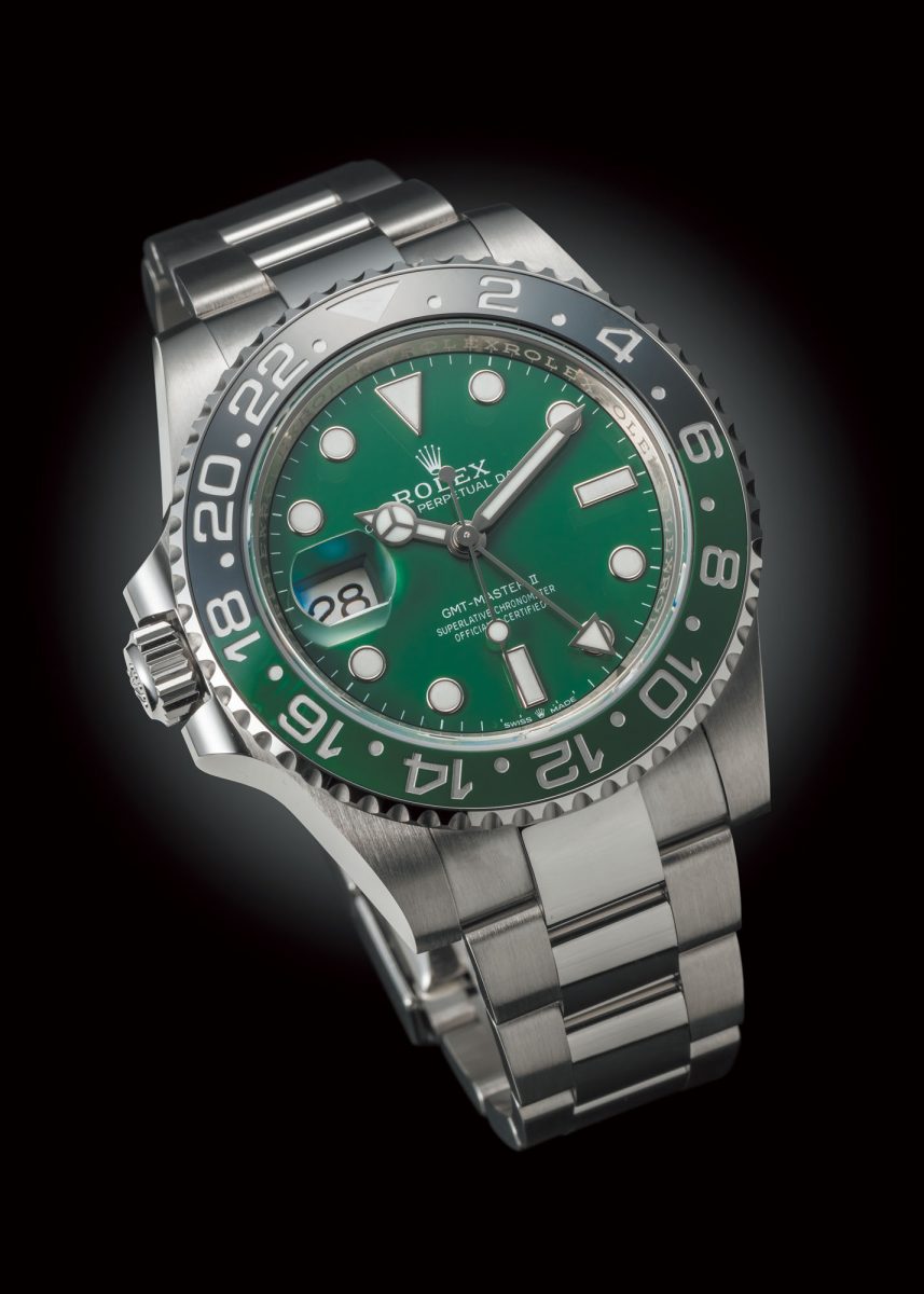 ツートーンのセラクロムベゼルの6時から18時までのグリーンと完全に同じ素材、色を文字盤に初採用。24時間で1周するGMT針の色を時分秒針と揃え、シックに仕上げた。ケースの左側にリューズを備えたこのモデルは、デイト表示も9時側に配置。回転ベゼルを使って3つの異なる時間帯を表示できる実用性は踏襲。