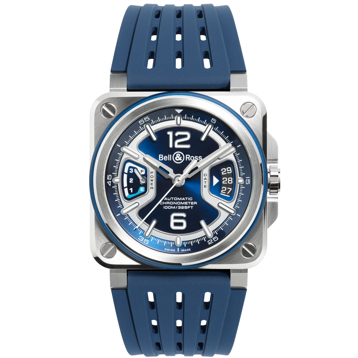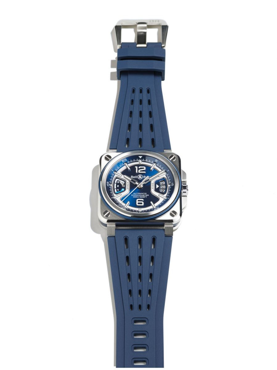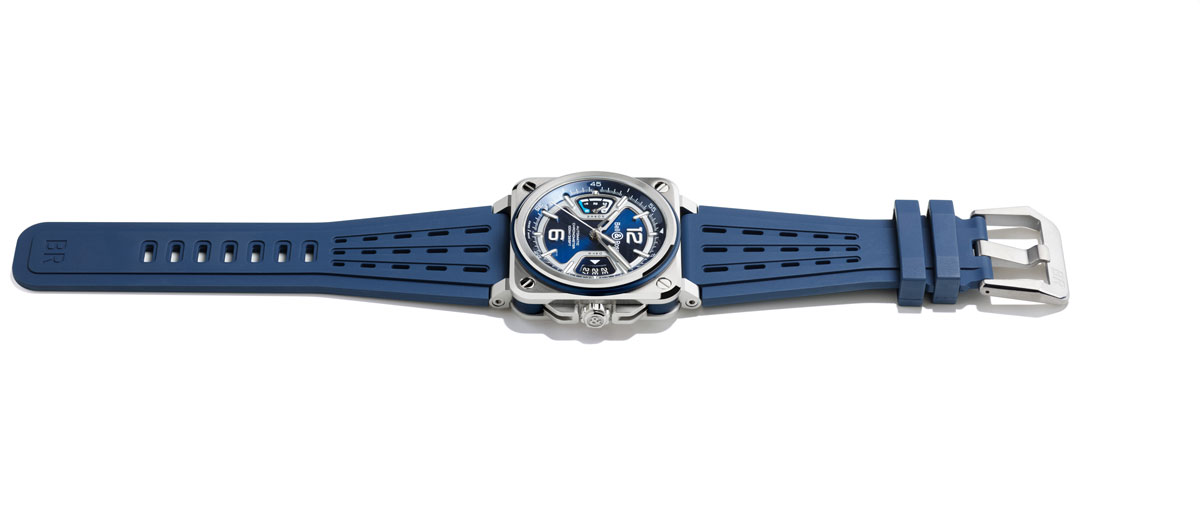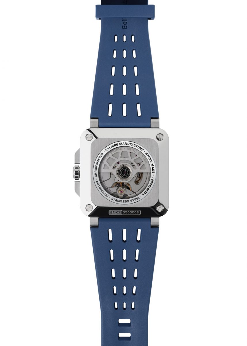 ベル&ロス「BR-X3 ブルー スティール」 Ref.BRX3R-BLU-ST/SRB 97万9000円/自動巻き(BR-CAL.323)、約70時間パワーリザーブ。チタンケース(シースルーバック)、ラバーストラップ、サファイアクリスタル風防(反射防止加工)。直径41mm、厚さ13.3mm。10気圧防水。