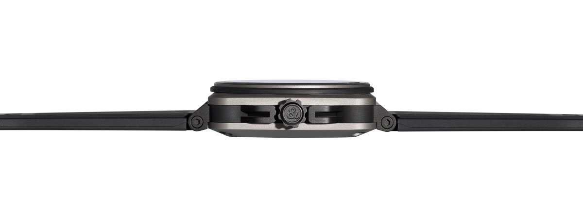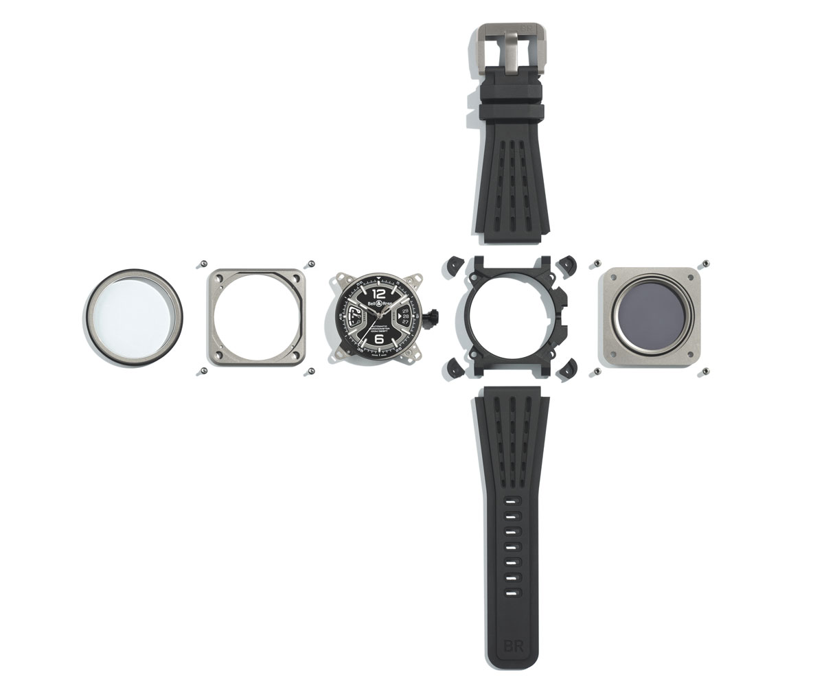 「BR-X3」コレクションは2モデルで構成され、まずひとつ目はケース全体にチタンを採用した「BR-X3 ブラック チタニウム」だ。チタンは航空宇宙や宇宙船、さらにはF1をはじめとするモータースポーツの世界でも使用されてきた素材である。スチールの約3分の2という軽さを持ちながら、強度重量比に優れ、腐食や傷にも強い。この41mm径のチタン製ケースに複数のパーツや層を組み合わせたマルチレイヤー構造を採用しており、上下2枚のグレーチタン製プレートによってコンポーネントをしっかりと固定。さらにその間をブラックカラーが貫き、素材、色調、仕上げが融合した立体的なケースを完成させている。ケース全体の堅牢性は4本のネジで確保され、チタンプレート、ミドルケース、ベゼル、ケースバックを強固に連結する。