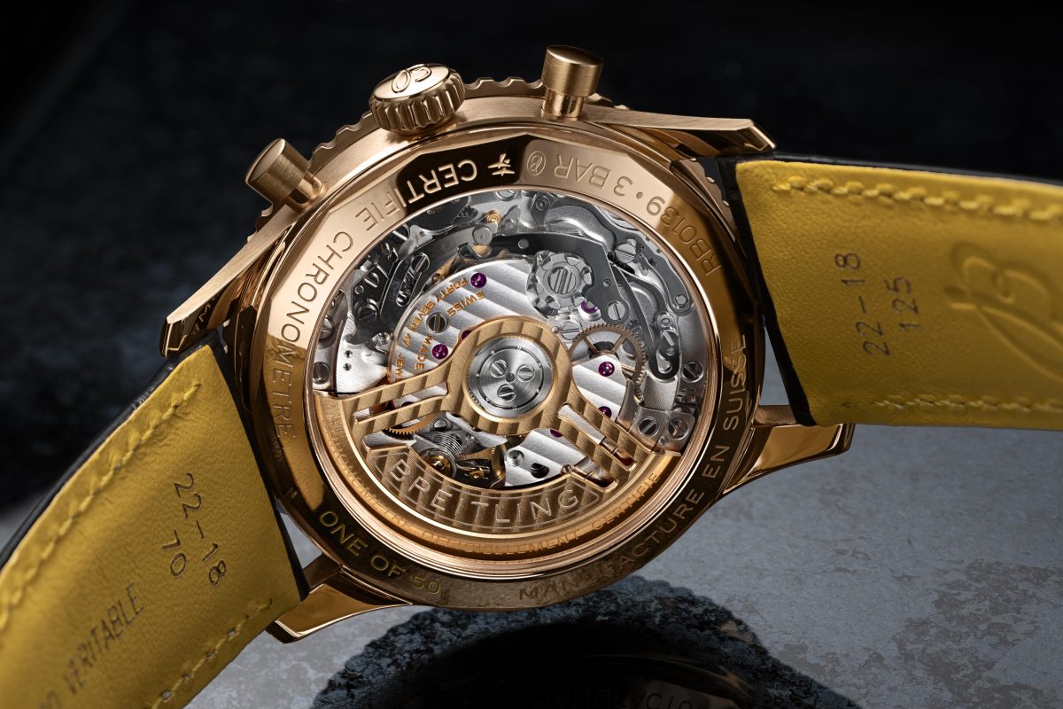 本機の心臓部には、精度と信頼性の最高基準を保証するCOSC公認クロノメーターの自動巻きムーブメント「キャリバー ブライトリング01」を搭載。346もの部品で構成され、ブライトリング・クロノメトリーで丹念に組み立てられた同ムーブメントは、500Gで約6万回の衝撃テスト、10万回以上のリューズ巻き上げ、345万6000回のローター巻き上げなど、独自の過酷な試験をクリアし、その実力は折り紙つき。裏ブタはシースルー仕様となり、精巧なキャリバーの姿を眺めるひとときは、本機を所有する喜びをいっそう深めてくれるはずだ。裏ブタの外周には50本の限定生産であることを示す「ONE OF 50」の刻印も施され、日本限定モデルとして隙のない仕上がりとなっている。