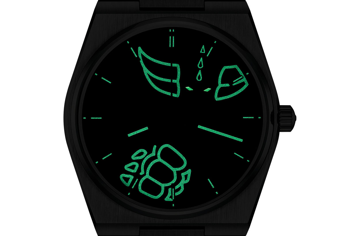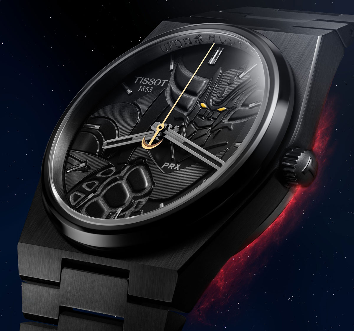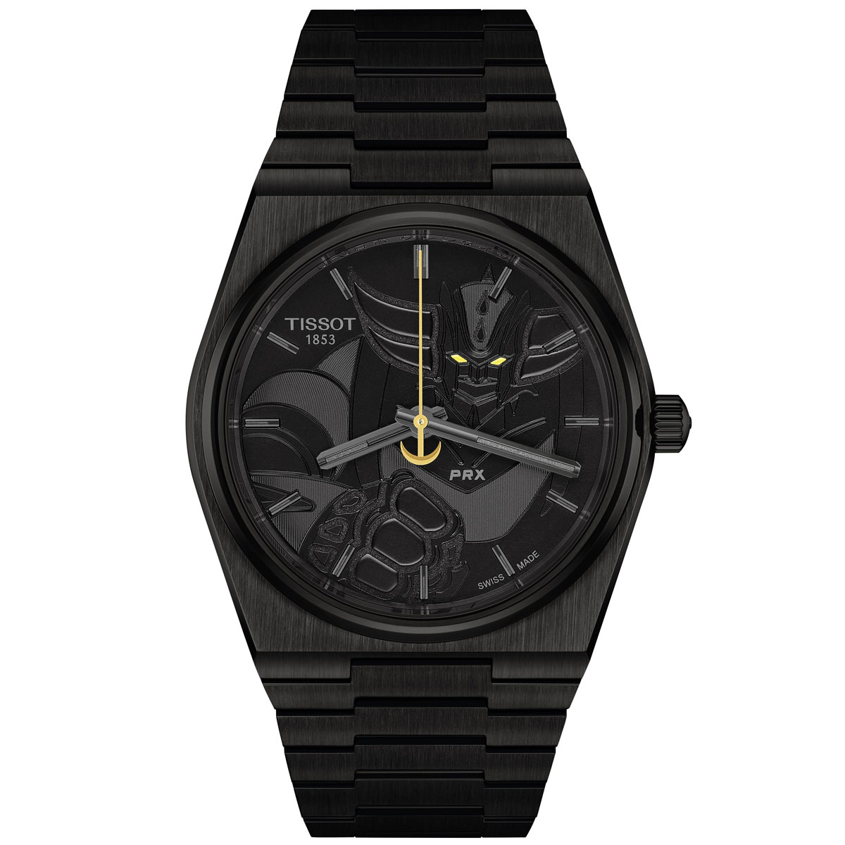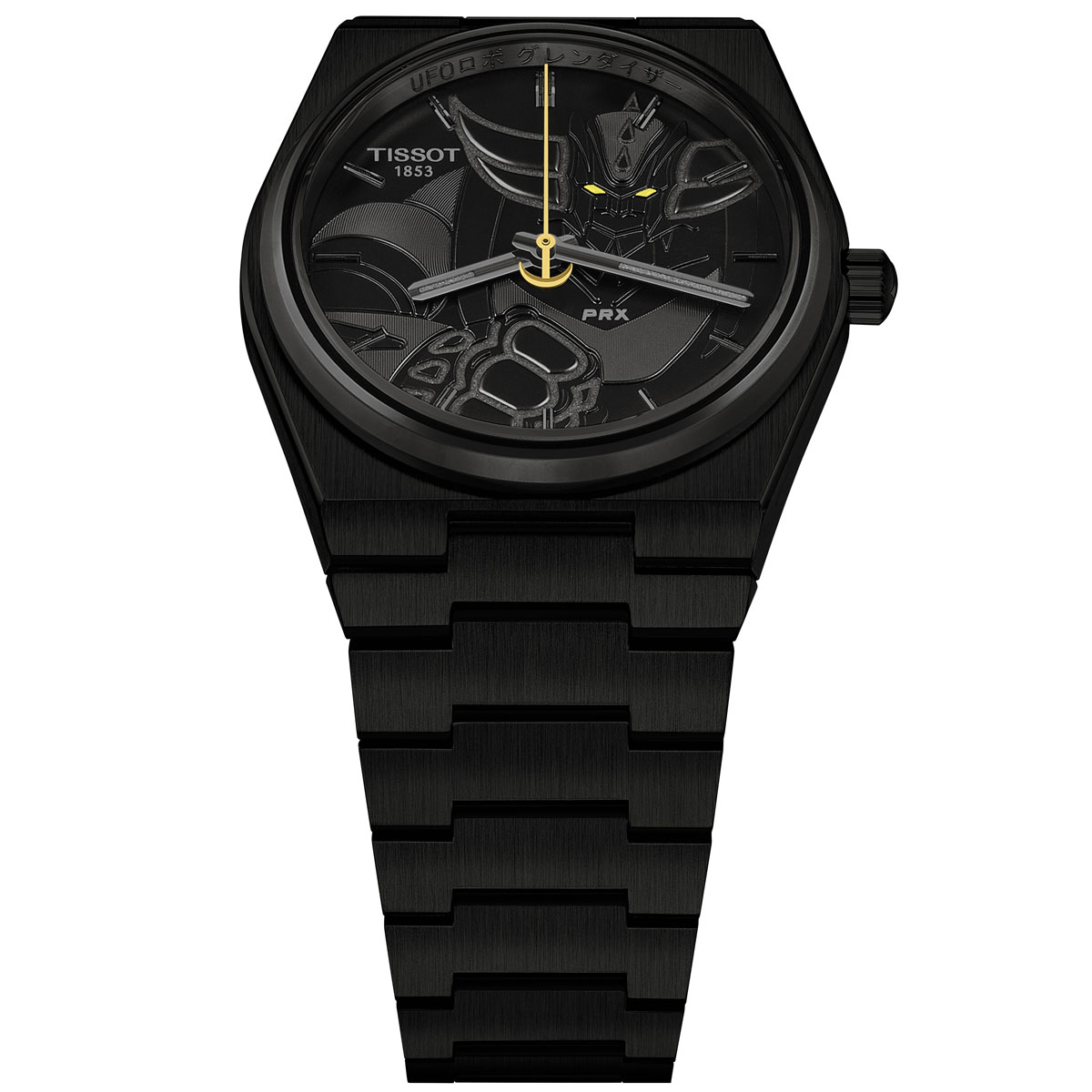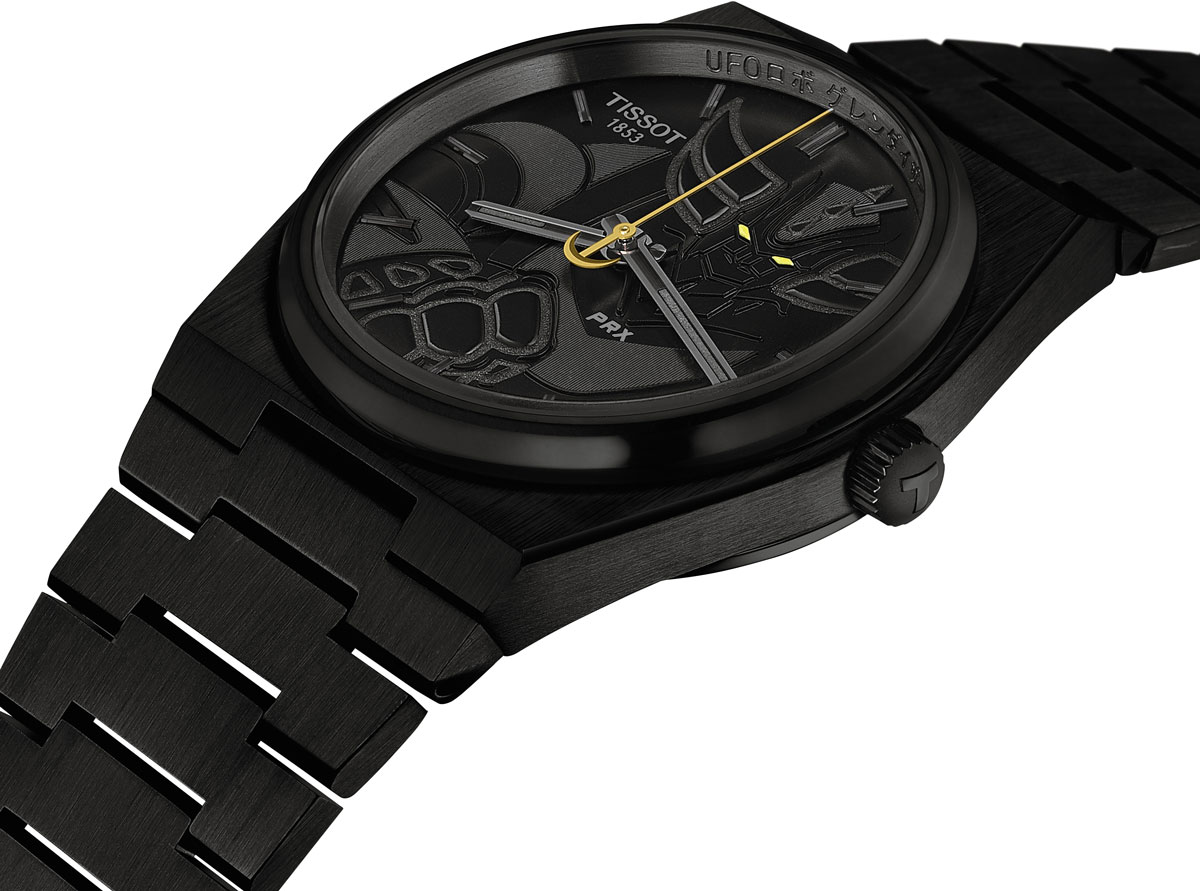 まるで宇宙の深淵から生まれたかのようなフルブラックPVDコーティングを施したPRXは、地球を守るため星々から舞い降りた孤高のヒーロー「UFOロボ グレンダイザー」の神話的エネルギーを体現している。平和を守り、試練に耐え抜くために生まれ、漆黒の空の中でも輝く運命を背負った英雄の旅路を映し出すのが、PRXの象徴的なブレスレットだ。さらに、レトロフューチャリズムを想起させるヴィンテージアニメの魅力と、スイス時計製造の卓越したノウハウが随所に息づいている。サファイアクリスタル越しに文字盤いっぱいにそびえ立つグレンダイザーは、ダイナミックなポーズで力強さを放つ。複雑なエングレービングと幾重にも重なるテクスチャーが彫刻のような質感を生み、ヒーローの存在感を際立たせている。その目は強烈な黄色に輝き、シルエットをなぞったスーパールミノヴァ®が暗闇でビーコンのような光を放つ。さらに、ダブルハーケンを模した18Kゴールド製の秒針が正確に時を刻み続ける。