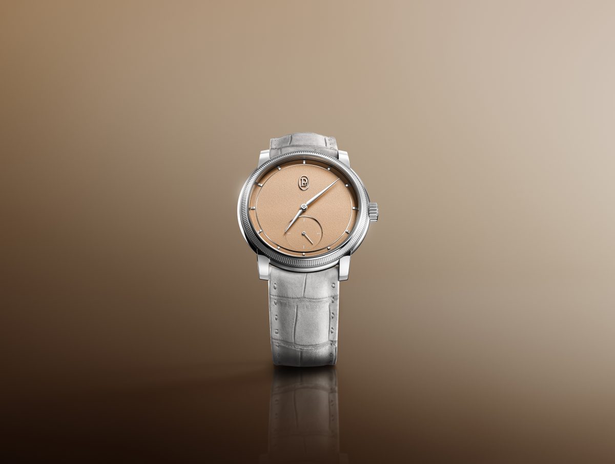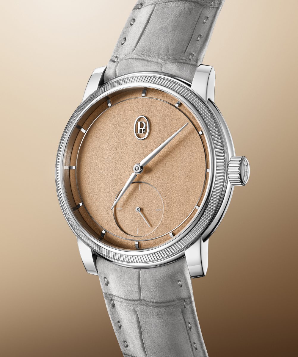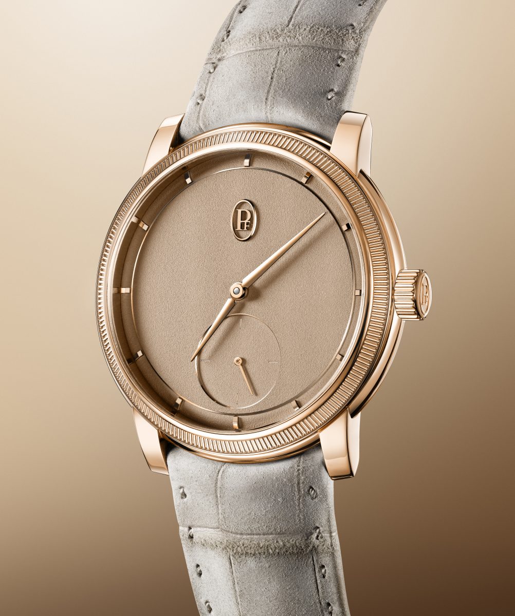 この「トリック プティ・セコンド」には、2つのモデルが揃う。ひとつ目の「ローズゴールド・デューン」は、18Kローズゴールド製ケースにグレイン仕上げのソリッドゴールド文字盤を採用。“サンドゴールド”と呼ばれるサンドカラーのアリゲーターストラップを装備しており、その柔らかく温もりのある仕上がりが印象的だ。もうひとつの「プラチナ・ゴールデンアワー」は、プラチナ950製ケースに、同じくグレイン仕上げのソリッドゴールド文字盤を収める。“アコヤグレー”と名付けられたグレーグリーンのアリゲーターストラップを装備し、ゴールドとグレーの響き合いが洗練された個性を際立たせている。どちらのモデルも、内部には「トリック」コレクションのために特別に開発された手巻きムーブメント「キャリバーPF780」を搭載。厚さわずか3.15mmでありながら、ふたつの香箱で駆動し、60時間のパワーリザーブを備える実用性の高いムーブメントとなる。