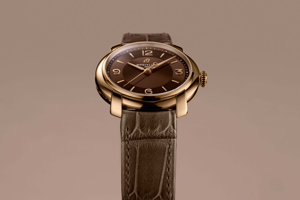 「レディ プレミエ」は、36mmと32mmの2サイズで展開される。まず、36mmモデルはステンレススチール製と18Kゴールド製のケース素材が用意され、前者にはオーベルジン、セージ、ダブグレーの3種の文字盤をラインナップ。文字盤のカラーに合わせたグラデーションのアリゲーターストラップを採用し、エレガントでありながらカジュアルさも醸し出す絶妙な仕上がりが印象的だ。18Kゴールド製モデルでは、ブラウン文字盤にチョコレートカラーのストラップを合わせて、落ち着きと気品ある表情を作り出した。文字盤は中央と外周で異なる仕上げを施し、さらに立体的なインデックスやロザンジュ型の針など個性的なディテールを採用。内部には、約42時間のパワーリザーブを誇るCOSC認定自動巻きムーブメント「ブライトリング キャリバー10」を搭載する。