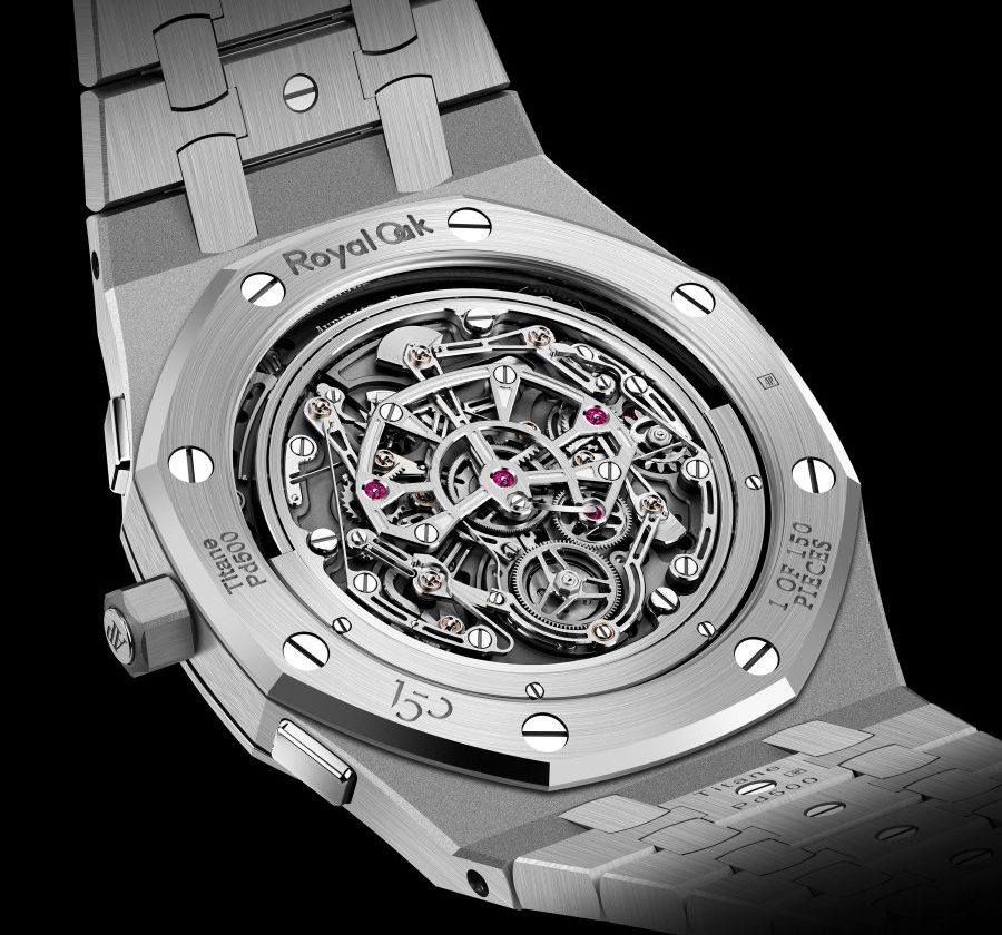 そして本機の存在感を際立たせるのは、メゾンの象徴である“ナイトブルー、クラウド50”の色彩を纏うプチタペストリー文字盤だ。この文字盤に、ロジウムトーンのゴールドのアワーマーカーと蓄光加工をした18Kホワイトゴールドの針を合わせることで、気品漂う表情を作り上げた。この6時位置にフライング トゥールビヨン、3時および9時位置にスネイル仕上げを施したカウンターを配する。長いクロノグラフ針は軽量なチタン製としている点も特徴だ。なおブランド創業150周年を記念し、アーカイブから蘇らせた特別な「Audemars Piguet」のシグネチャーを12時位置に冠しており、ケースバックには「1 of 150 pieces」と「150」のロゴが刻印されている。