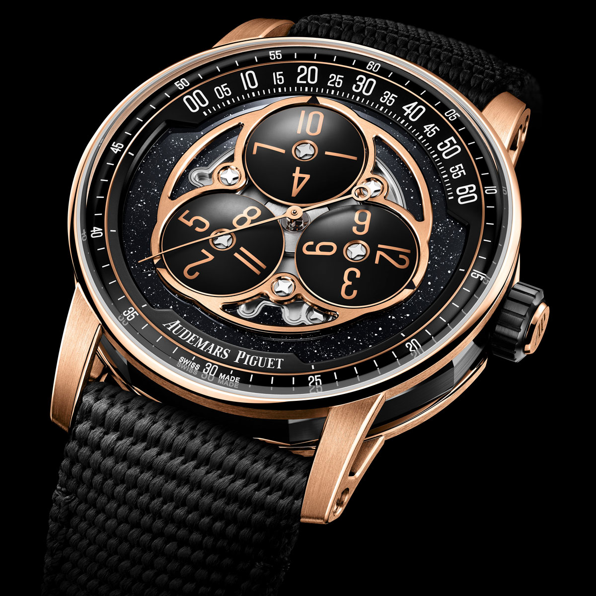 「CODE 11.59 バイ オーデマ ピゲ スターホイール」の特徴的なアベンチュリンダイアルによって際立つ印象的なツートーンのデザインは、創業150周年を迎えたマニュファクチュールが受け継いできた伝統と職人技へのオマージュである。「スターホイール」は、時刻表示用ディスクを支える星型のネジにちなんで名付けられ、1991年から2003年にかけて、約30種類のモデルが製作された。2022年には「CODE 11.59 バイ オーデマ ピゲ」コレクションに初登場し、ヴァガボンドアワーを搭載した自動巻きムーブメント、キャリバー4310が初めて採用された。本モデルでは、18Kピンクゴールド製のベゼルとケースバックに、ブラックセラミックのミドルケースを組み合わせることで、CODE 11.59の立体的なケース構造を際立たせている。素材と色のコントラストはダイアルにも及び、ブラックアベンチュリンのプレートがヴァガボンドアワー表示に幻想的な輝きを添える。