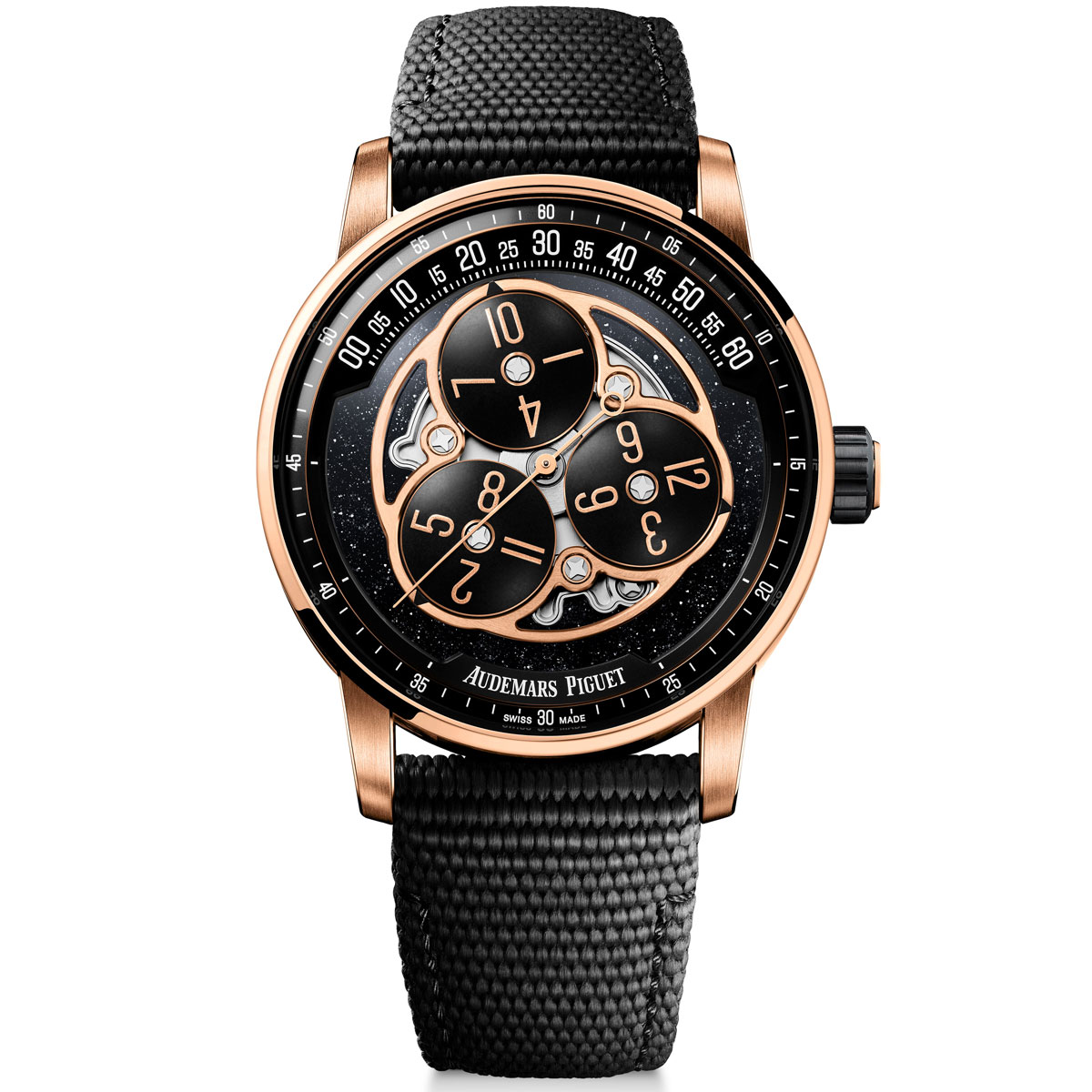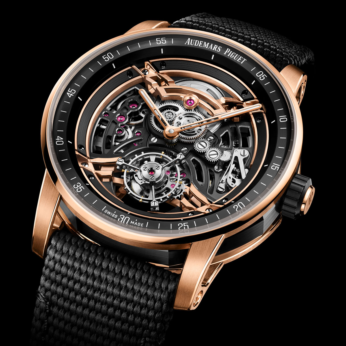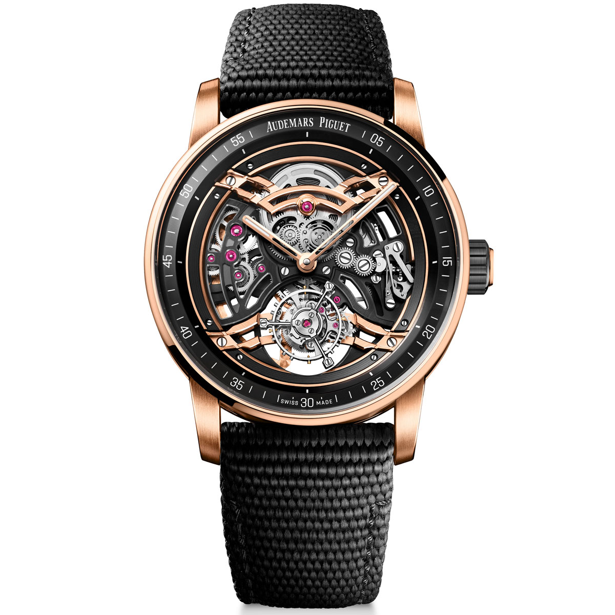 オーデマ ピゲ「CODE 11.59 バイ オーデマ ピゲ フライング トゥールビヨン オープンワーク」 Ref.26601NR.OO.D002KB.01 価格要問い合わせ/自動巻き(Cal.2980)、毎時2万1600振動、約65時間パワーリザーブ。18Kピンクゴールドケース(シースルーバック)、ラバー加工ストラップ。直径41mm、厚さ11.8mm。3気圧防水。