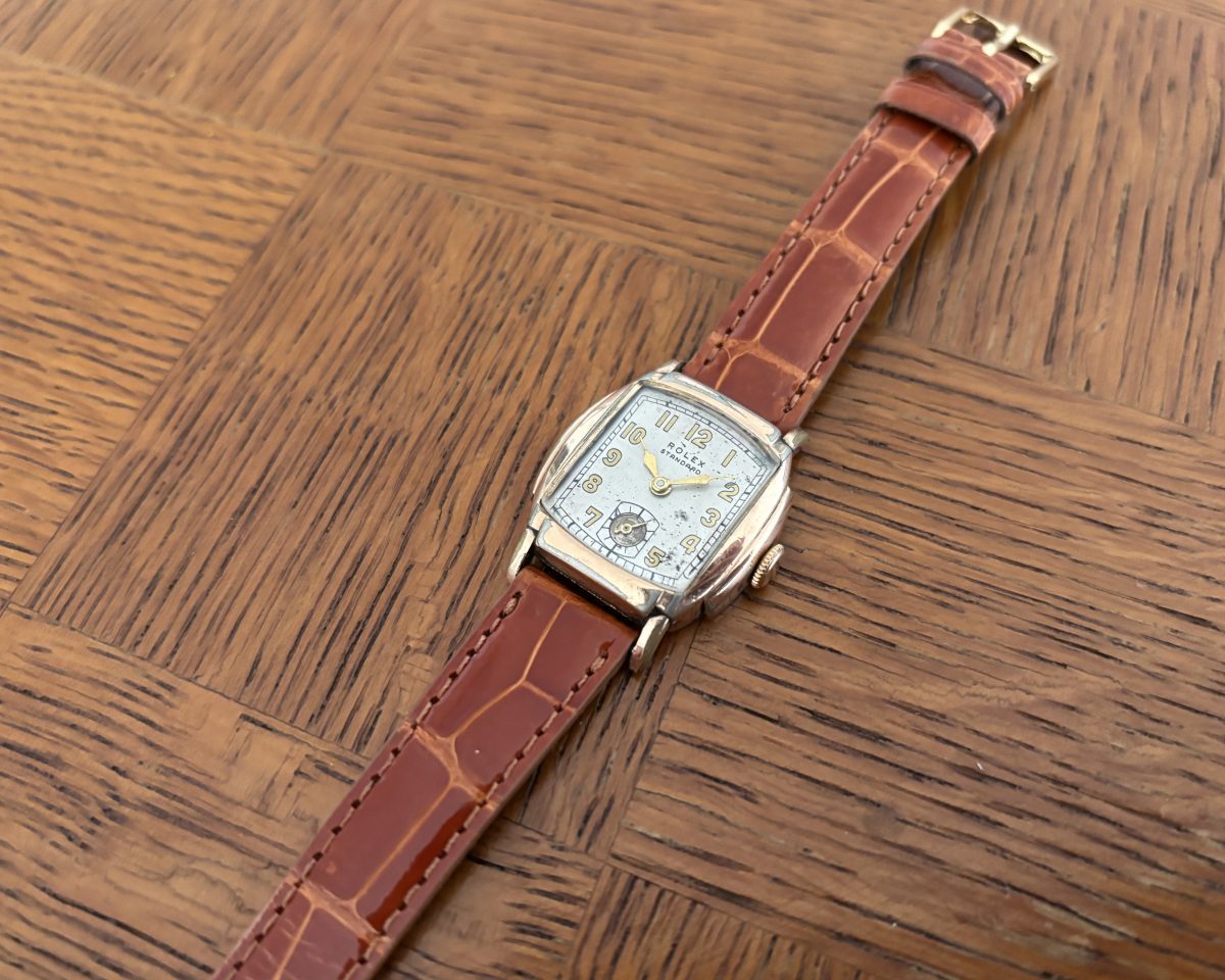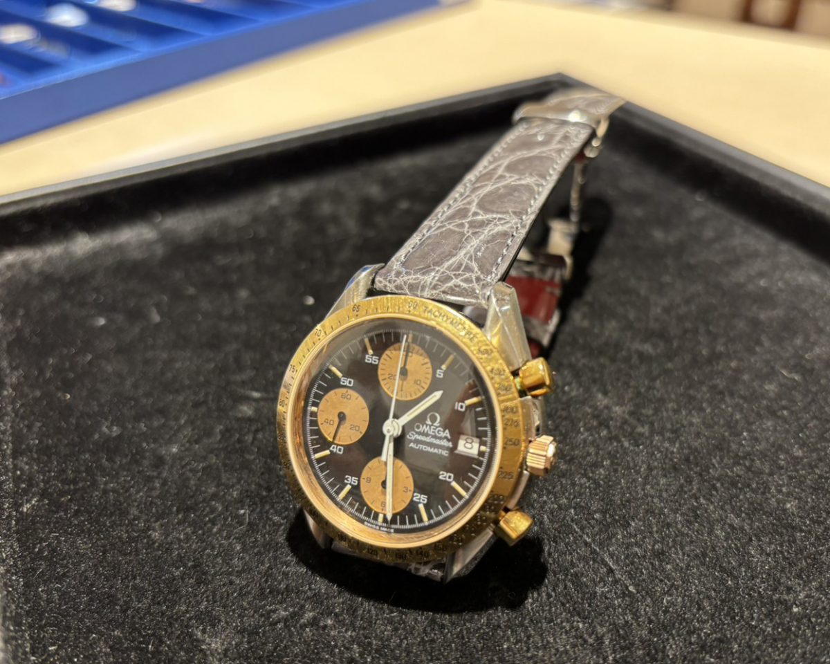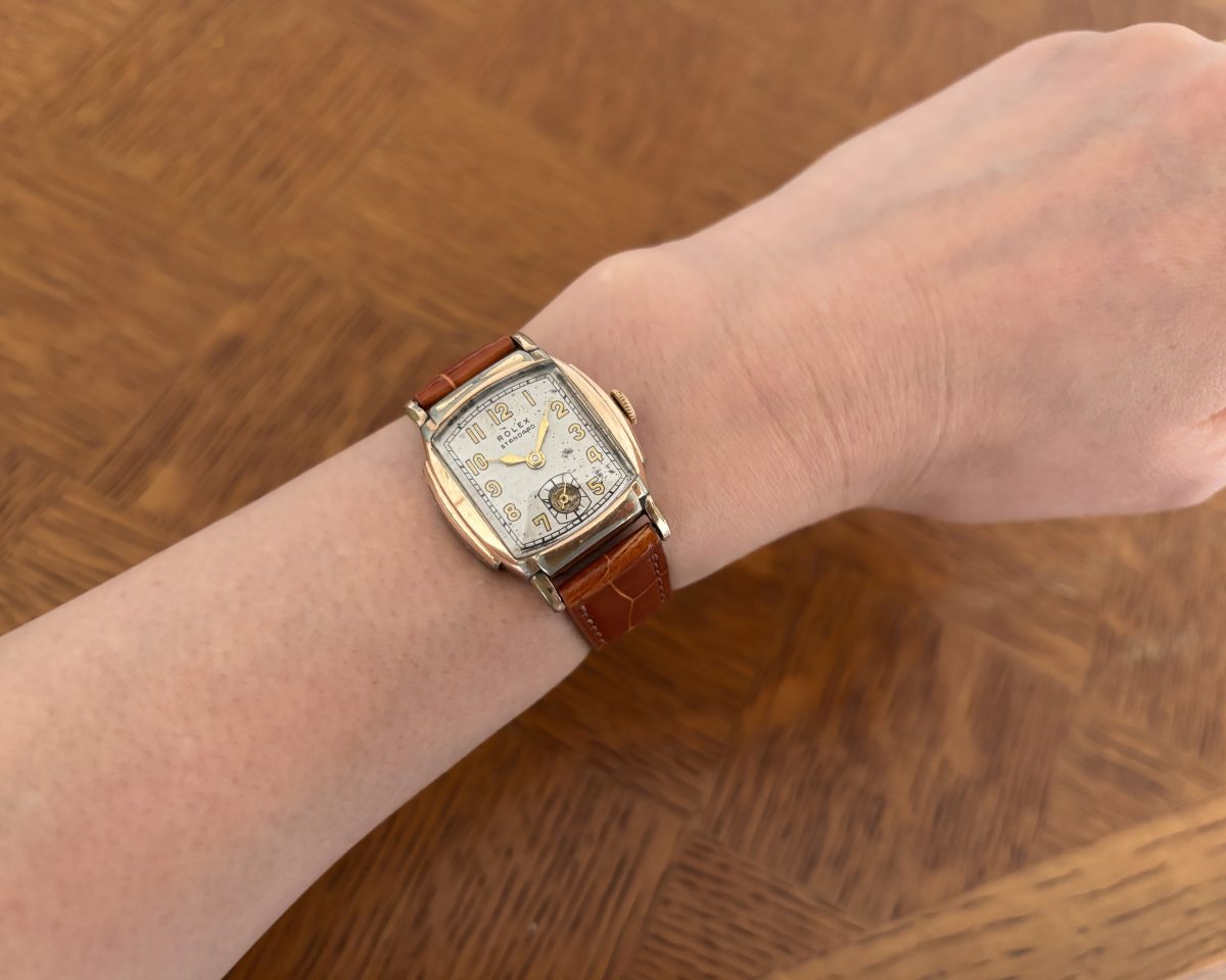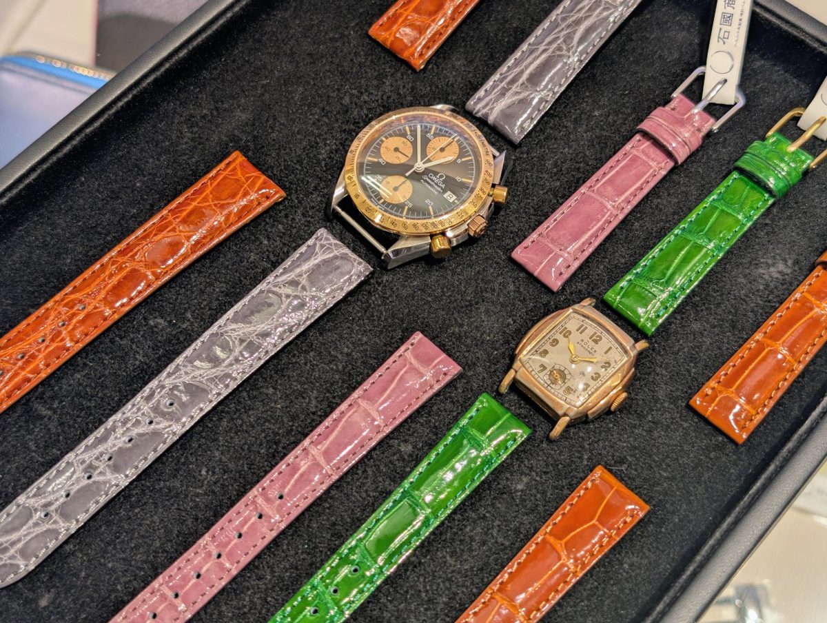 猪羽さんが選んでくれたのは、ワニ革素材の3本。クラシックに馴染むブラウン(クロコダイルレザー)のほか、ピンクとグリーン(いずれもアリゲーターレザー)という意外性のあるカラーが並ぶ。普段はどうしても無難な色を選びがちな筆者にとって、この鮮やかなトーンは新鮮で、心をくすぐられた。悩みに悩んだ末、最終的にやはり王道のブラウンを選んだものの、艶やかなクロコダイルを合わせただけで、時計が驚くほど華やかに、そして気品を帯びて蘇った。レトロなフェイスに光沢のあるストラップが映え、まるで新しい時計を手に入れたかのような高揚感がある。