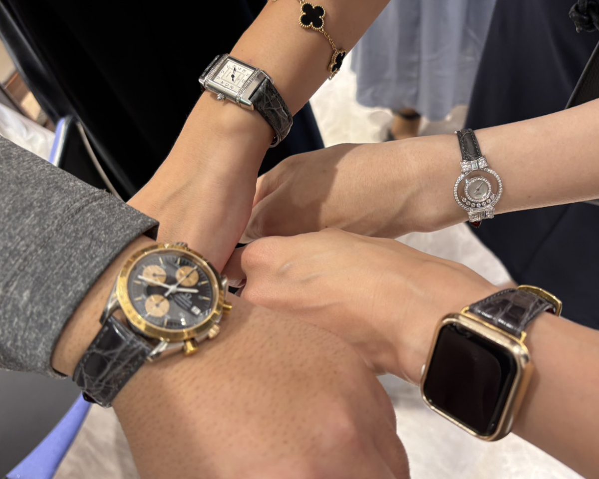 新しいストラップをまとった腕時計を眺めてうっとりしていると、ふと周囲から賑やかな声が聞こえてきた。編集者が選んだカイマンのアッシュグレーは、店内で最も人気の色で、偶然にも他の女性3名も同じものに取り替えていたのだ。「合わせる時計ごとに魅力が引き立つ!どれもドレッシーで素敵!」と皆さん興奮気味で、楽しそうにリストショットを撮影し始めていた。思いがけない一期一会の楽しいひとときだった。