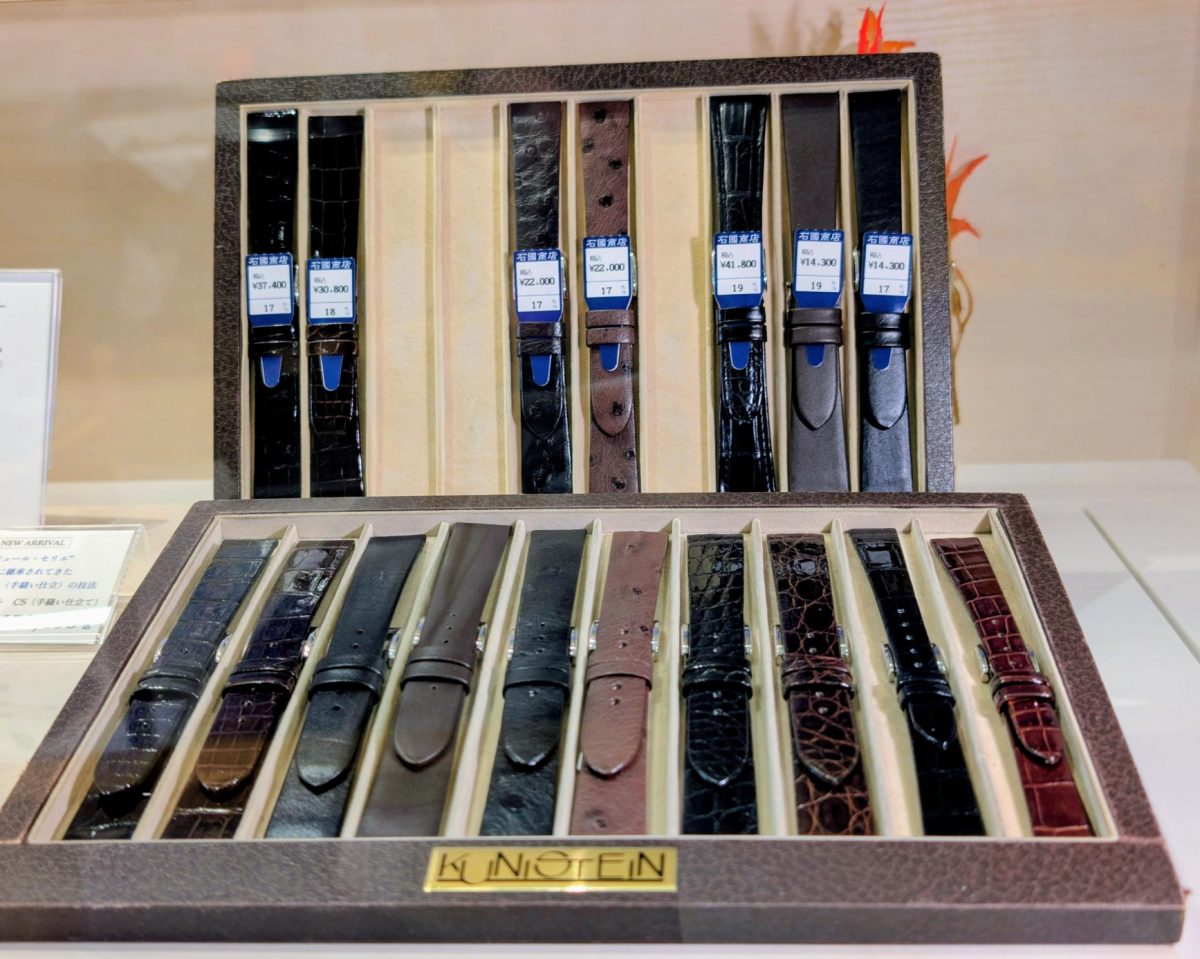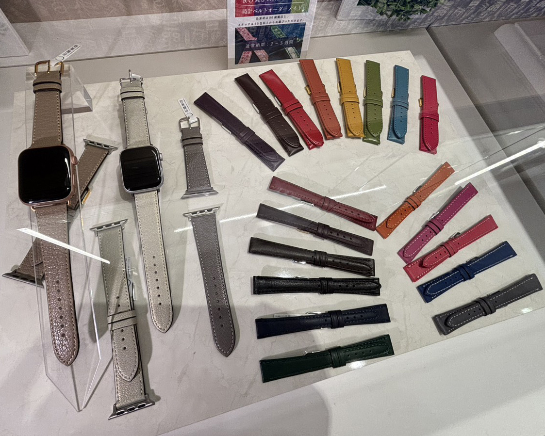 大手町店では、自社ブランド「クニスタイン」と「ロコッテ」の2シリーズを中心にストラップを展開している。「クニスタイン」は、ベテラン職人が手掛ける最高峰ラインで、価格は1万3200円~約6万円。厳選された本革を使用し、表革を裏側に巻き込む“へり返し仕立て”で制作。装飾を控え、素材本来の質感を引き出した正統派の仕上がりだ。一方の「ロコッテ」は、素材やカラーバリエーションの豊富さが魅力で、価格は4400円〜約3万円。手軽にストラップ交換を楽しめるポジションながら、ヨーロッパ伝統の“切り身仕立て”を採用し、コバを塗り重ねて仕上げる本格派だ。