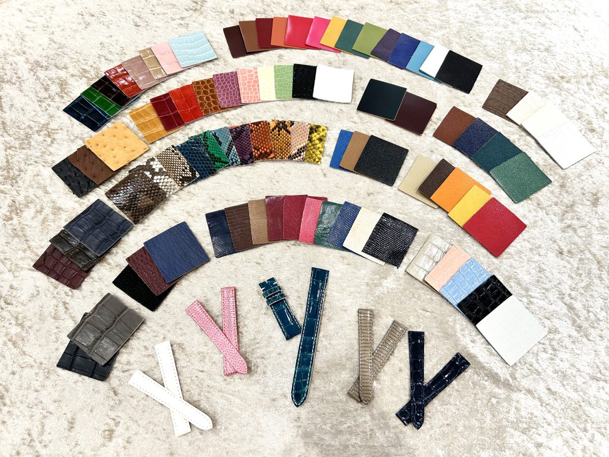 手軽な価格帯と豊富なバリエーションを掲げ、“華やかな彩りで、腕元を美しく演出する”をテーマとするロコッテだが、品質は本格派だ。熟練の技を持つ職人が、厳選された国産レザーを丁寧に手縫いで仕上げている。素材はクロコダイルやカーフなどの定番はもちろん、オーストリッチ、リザード、コードバン、シャーク、パイソン(オーダーメイド)と幅広い。オーダーメイドにも対応しており、素材の基本料金にプラス約1万円で、納期は約3週間。ストラップのオーダーメイドは、上質な趣味として憧れを感じさせる魅力がある。