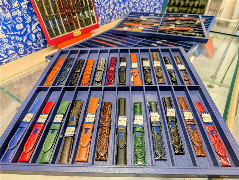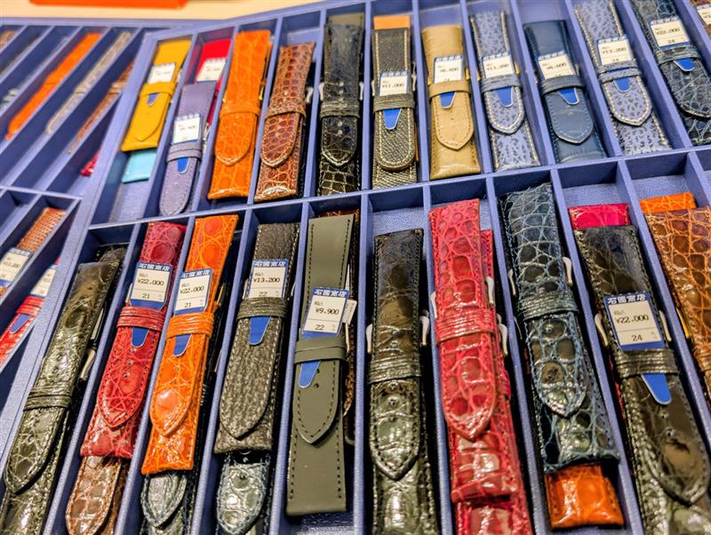 「ストラップの衣替え」を目的に訪れた筆者は、ロレックスの1930年代製ヴィンテージモデルを持参。店内で対応してくれたのは、時計修理技能士資格を持つ小売部部長・猪羽次郎さんだ。ストラップに関するあらゆる質問に、猪羽さんは即座に、しかも的確に答えてくれる。その知識の確かさに、自然と信頼感が湧いてくる。そこで今回は、猪羽さんにストラップの“お見立て”をお願いすることにした。膨大なバリエーションの中から自分で選ぶのは骨が折れるし、プロの審美眼に委ねれば間違いはないという魂胆だ。