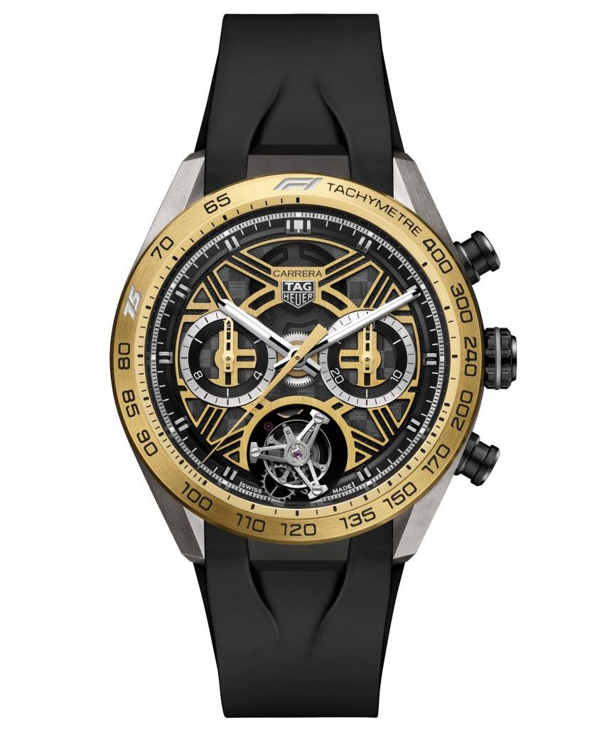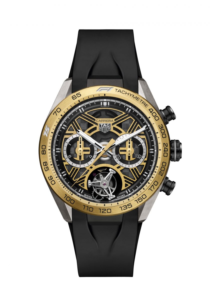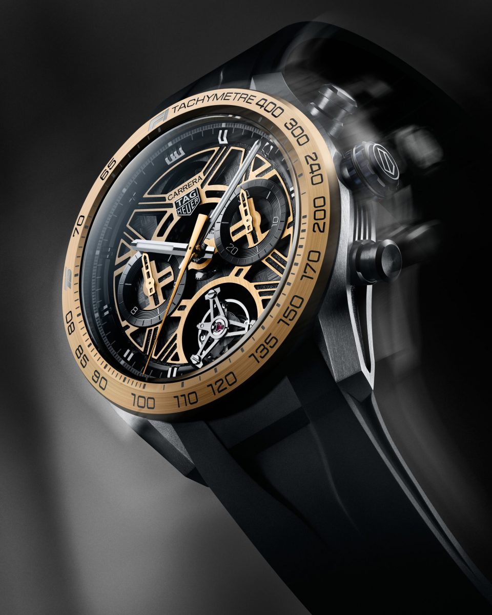 本機は、ゴールドとブラックが大胆に絡み合うエネルギッシュな外観が特徴だ。サテンおよびサンドブラスト仕上げを施した堅牢なチタン製の44mm径ケースに、ソリッドな18Kイエローゴールド製の固定式タキメーターベゼルを融合。さらにポリッシュ仕上げとブラックDLCコーティングで高級感を押し出したグレード5チタン製のリューズとプッシュボタンを備える。コレクションのシグネチャーであるオープンワークダイアルには、ロジウムコーティングのインデックスと時分針、さらにはイエローゴールドのシャープなクロノグラフ針をセット。2つのクロノグラフカウンターはアジュラージュ加工でアクセントを与え、6時位置にトゥールビヨンを鎮座させた。これらのように、複数の機能と仕上げ、色彩がクロスオーバーする本機からは、モータースポーツに密接に関与してきたタグ・ホイヤー独自の美的センスが活かされている。