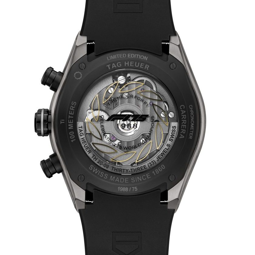 また、本機ならではのディテールとして、18Kイエローゴールドベゼルの12時位置にシルバーのF1®ロゴ、そして75の目盛りには公式のF1® 75周年記念ロゴがあしらわれている。そしてサファイアクリスタルバックには、F1® 75周年記念ロゴに加えて、F1®チャンピオンシップ開催年のいずれかの年号が入り、オンリーワンのタイムピースであることを強調する。また、ここを通して覗くことができるメカは、自社製造の自動巻きトゥールビヨンムーブメント「キャリバーTH20-09」である。クロノグラフ機構のパーツにコラムホイールと垂直クラッチを採用し、約65時間のロングパワーリザーブを有する信頼性の高いこのムーブメントを、時計の表からも裏からも鑑賞できるのだ。なおブラックラバーストラップには、ケースと同素材となるDLCチタン製バックルが搭載されており、スポーティーな印象と快適な装着感を実現。高い実用性も、本機が完成されたモデルであることを証明している。