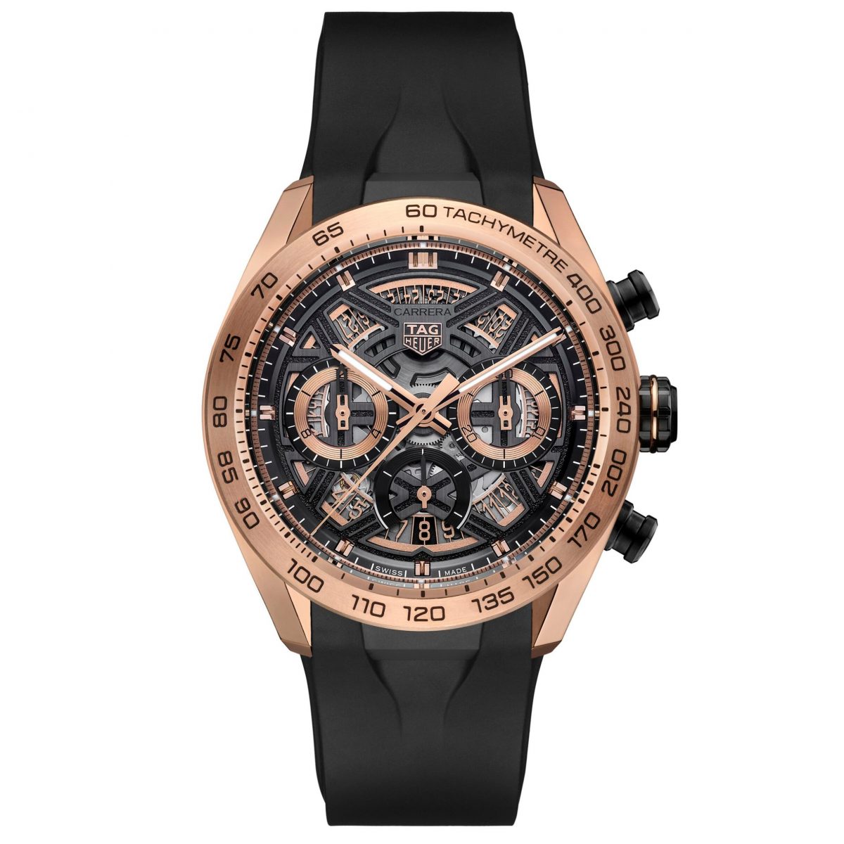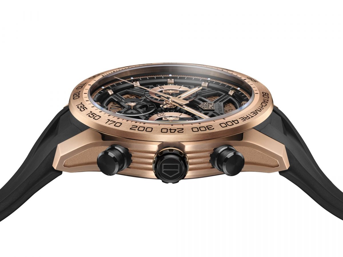 タグ・ホイヤー「タグ・ホイヤー カレラ クロノグラフ エクストリームスポーツ」 Ref.CBU2051.FT6273 329万4500円/自動巻き(Cal. TH20-00)、毎時2万8800振動、80時間パワーリザーブ。18K 5Nローズゴールド製ケース(シースルーバック)、ラバーストラップ。直径44mm。10気圧防水。