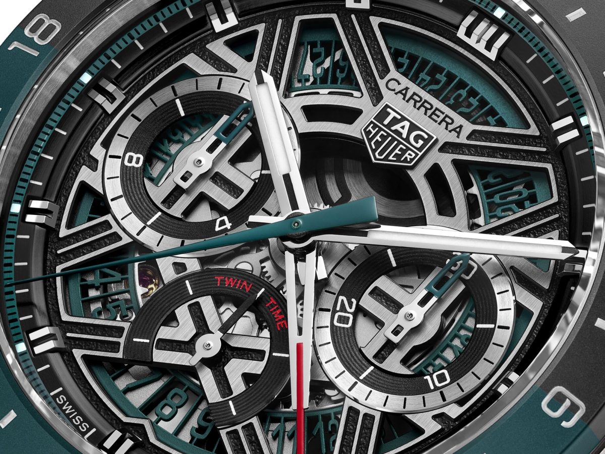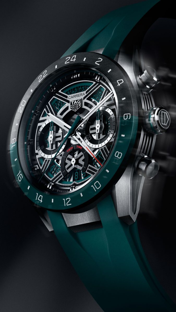 「タグ・ホイヤー カレラ クロノグラフ ツインタイム」は、「タグ・ホイヤー カレラ エクストリームスポーツ」シリーズ史上初めてGMT機能を搭載したモデルとなる。「タグ・ホイヤーカレラ」において、GMTを象徴するカラーであるティールグリーンで、ラバーストラップからダイアル、センター針、ベゼルをアレンジすることで、モダンでありながらアクティブなエネルギーを宿す外観を実現。特徴的なオープンワークダイアルは、モーターレーシングから着想を得たデザインとなり、3時・6時・9時位置に配された3つのサブダイアルは、ダッシュボードの計器類を想起させる秀逸な仕上がりだ。文字盤の12時位置には「CARRERA」の文字とブランドロゴを配し、そのアイデンティティをさりげなくアピール。6時位置にレイアウトされるオープンワーク仕様の日付けディスクは、ホワイトのスーパールミノバ®が塗布され、夜間における高い視認性も確保している。