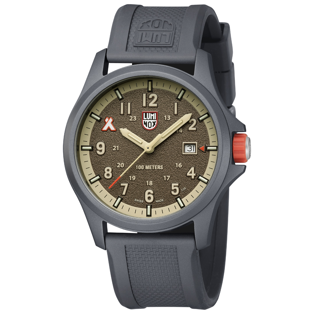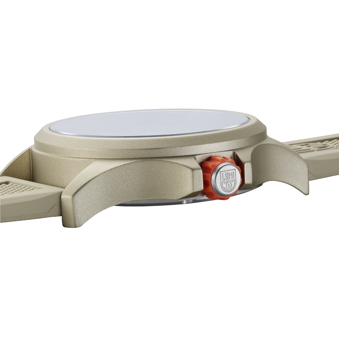 砂目調の文字盤は視認性を高め、時針に搭載された【ルミノックス・ライト・テクノロジー(LLT)】が暗闇を含むあらゆる環境で25年間の発光を実現。オレンジのリューズ、10時位置の象徴的ロゴ、ケースバックに刻まれた「Never Give Up」のモットーなど、ディテールの随所にベア・グリルス氏の精神が息づく。カラーはサンドとアントラサイトの2種類。ケース径43mm、スイス製クォーツムーブメント(RONDA)、反射防止コーティング付きサファイアクリスタルガラスを採用。それぞれサンドまたはブラックのラバーストラップを組み合わせ、10気圧防水と14個のLLTを搭載する。昼夜を問わず、陸上探検で確かな視認性を発揮する一本だ。
