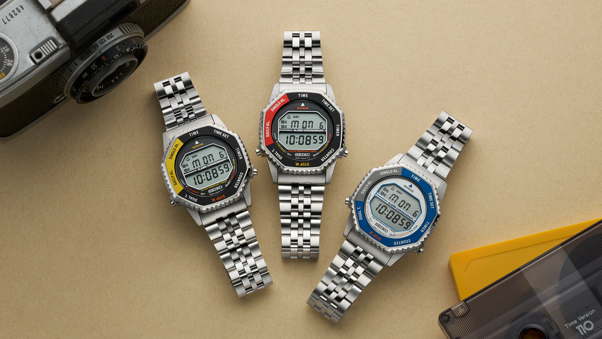 本作は、1982年モデルの手書き図面をもとに、独創的な特徴を忠実に踏襲しながら、現代技術によって質感と機能を進化させたデザイン復刻である。最大の特徴であるロータリースイッチ機構を、オリジナルとほぼ同サイズの37mmケースに搭載。メタルブレスレットはコマのピッチが短いオリジナルデザインを継承し、心地よい重量感と快適な装着性を両立している。ヘアラインと鏡面仕上げを巧みに使い分けることで、スタイリッシュかつ上質な印象に仕上がっている。デジタル表示部にはオリジナルフォントを再現。八角形パーツを回転させることで、アラーム、タイマー、ストップウオッチなど多彩な機能を直感的に切り替えることができる。3モデルともアルミニウム製の表示板を採用し、1980年代の人気カラーリングをオマージュしたレトロな雰囲気を漂わせる。