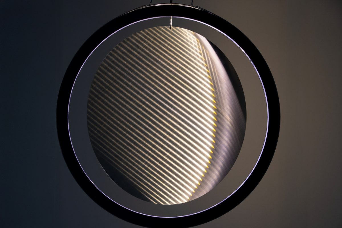 まず、小松宏誠氏の作品「月のモビール(Moon)」は、ステンレスの円盤が1分間に1回転し、そこに映る光が満ち欠けを繰り返すというもの。無機質な動きの中に、時を感じさせるものとして月をモチーフにしたロマンチックな作品となっている。