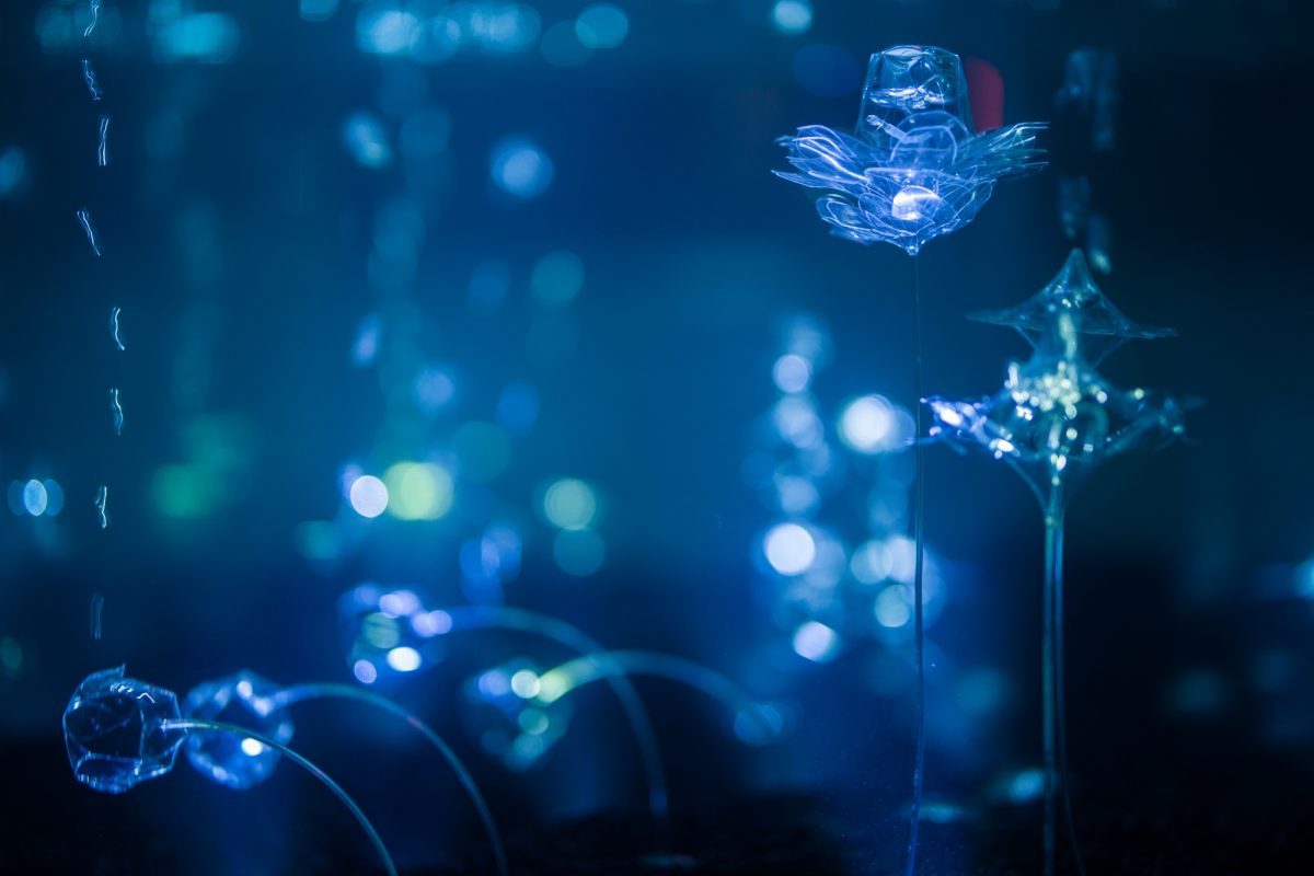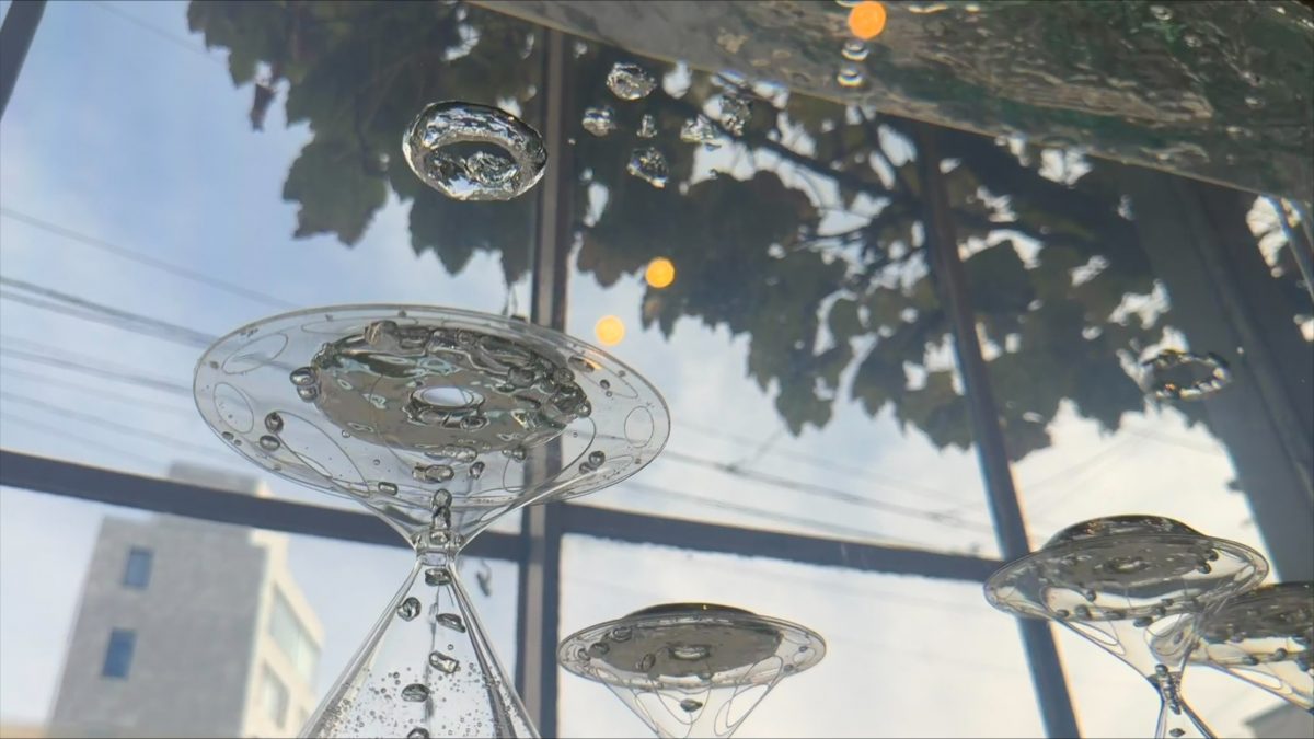 次に、小松宏誠氏と三好賢聖氏の共作である「プワンツ(PUWANTS)」。「プワンツ」は、水のなかで気泡の浮力によってゆったりと動くアート作品のシリーズで、今回は時間や腕時計のインスピレーションから生まれた新作と過去作のリメイク作品が出展される。砂時計の逆を表現したという作品では、装置上部に気泡が溜まるとバブルリングを放出。毎回違う形で放出されるバブルリングは、さまざまな時の流れがあることを感じさせる。