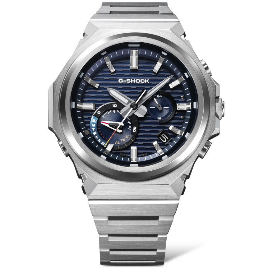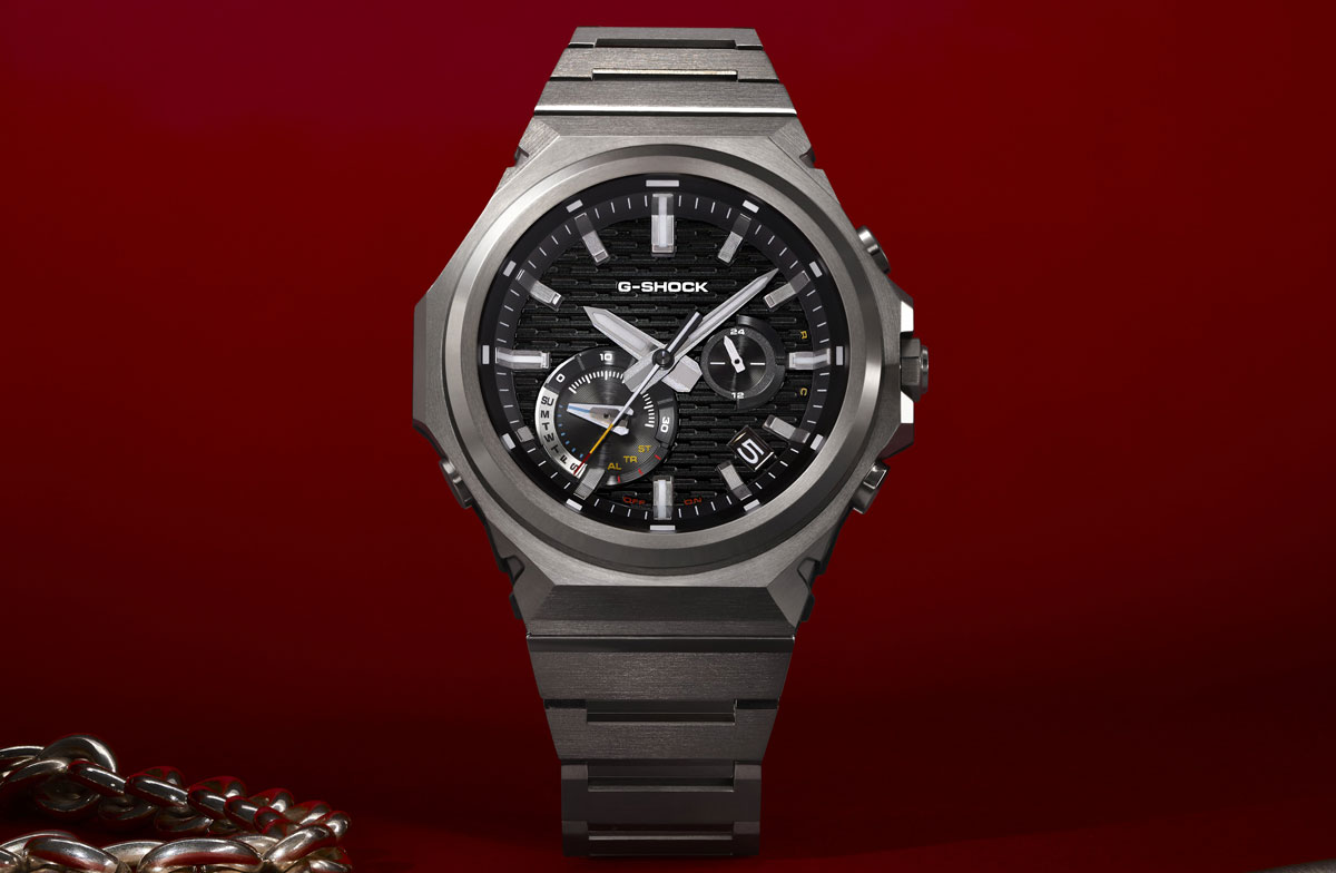 新作「G-STEEL GST-B1000シリーズ」は、1983年にデビューしたG-SHOCKのオリジン、DW-5000Cが打ち立てた“タフネス”という理念を継承するコレクションだ。本機に用いられている赤・青・黄のアクセントは、挑戦する情熱・防水・耐衝撃をイメージさせるカラーであり、オリジンを象徴する原点の記憶ともいえる。そして八角形ベゼルやレンガパターンは、現代のライフスタイルに着想を得たデザインである。ケースの直径44.2mm、厚さ11.6mm、重さ118gのサイズも、良好なフィット感と存在感をバランス良く保つ最適な設計で、ミニマルなデザインを追求したもの。さらにステンレススチール製のベゼルやバンドにはヘアラインとミラーで仕上げ分けを行い、光があたる角度や強さによって様々な表情を見せる工夫を凝らして、メタルウオッチとしてのクオリティも突き詰めた。