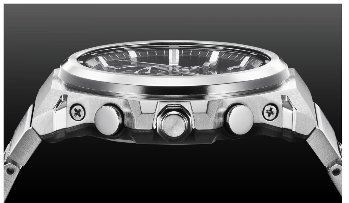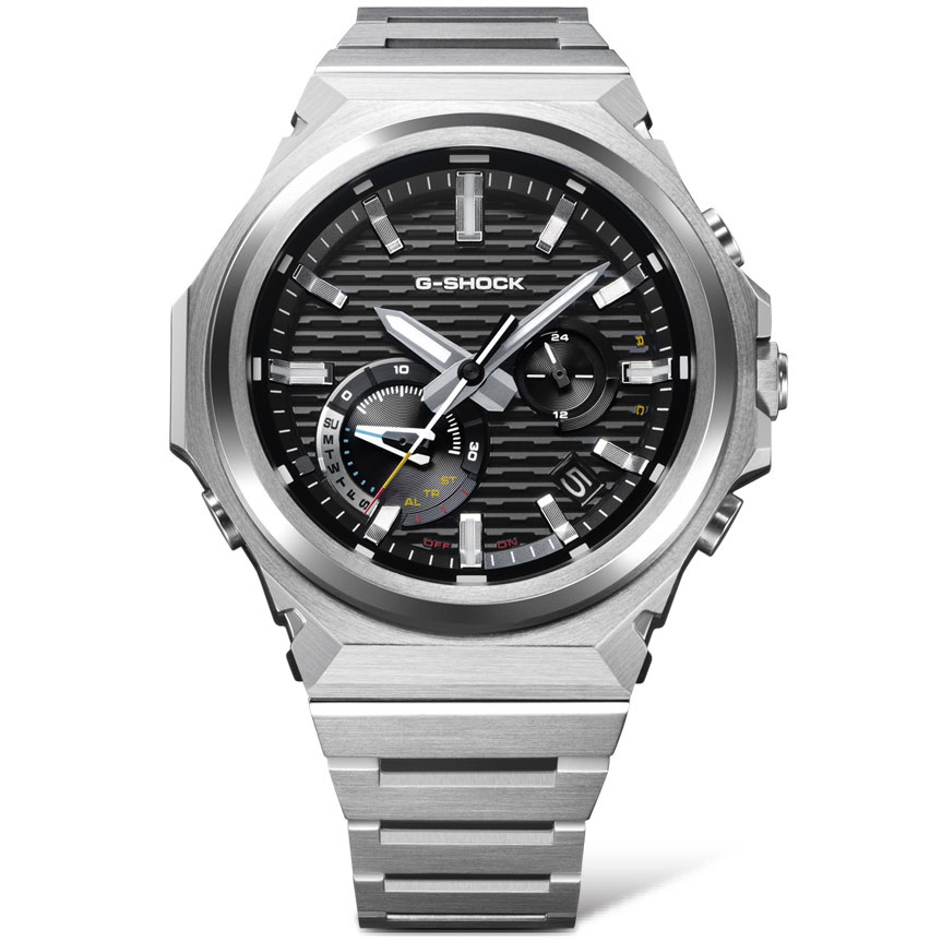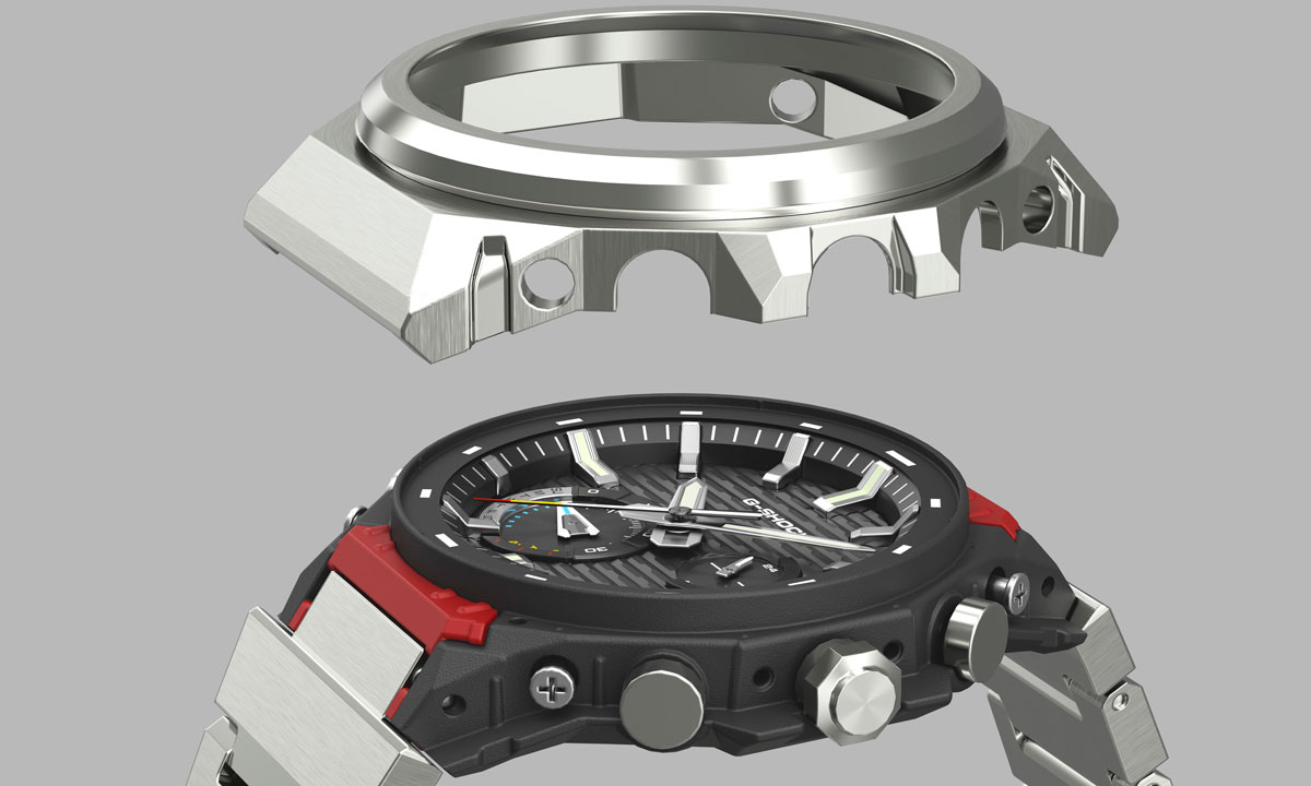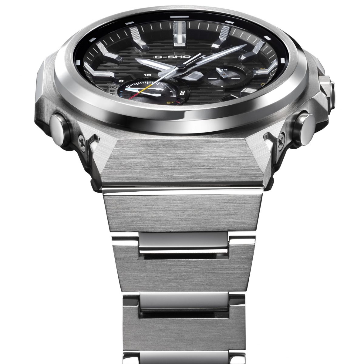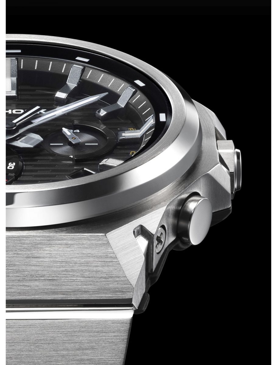 なお、ベゼルの下層にはカーボンファイバー強化樹脂を使ったケースが収められており、高い耐衝撃性と軽量化と実現。バンドの接続部にはウレタン樹脂の緩衝パーツをセットし、衝撃吸収と連結強度を高め、同時に薄く、軽いフルメタルの実用的なアナログG-SHOCKが完成へと至った。また、先進的なガラス接着方式や小型モジュールの採用も、本機の構成において重要な役割りを果たしており、主な樹脂パーツは環境負荷低減に貢献するバイオマスプラスチックが使われている。