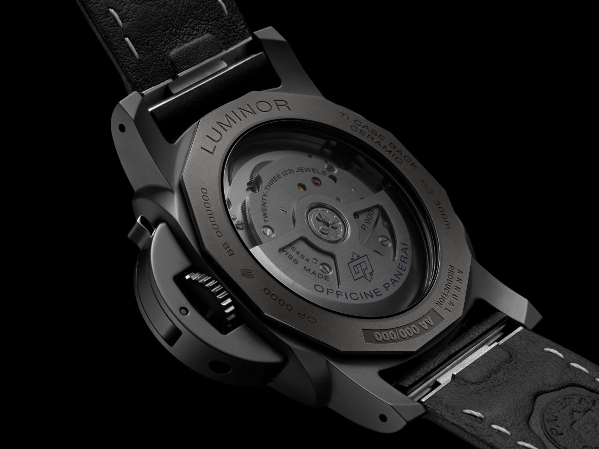本機は30気圧(約300メートル)の防水性能を備え、表記値より25%高い圧力下での試験もクリア。セラミックでこの強度と防水性を両立させるには高精度な製造技術が不可欠であり、その専門知識はブランドのマニュファクチュールで継承されている。例えば、ラグを含むケースの負荷が集中する部位を強化するため、広範な研究開発を重ねることで、パネライ独自の耐衝撃基準を満たす堅牢性を獲得している。