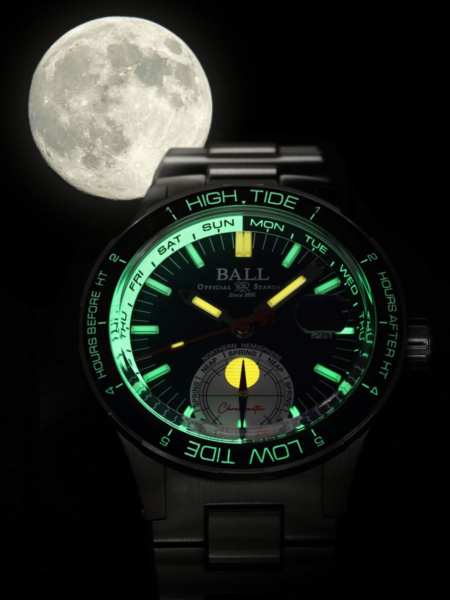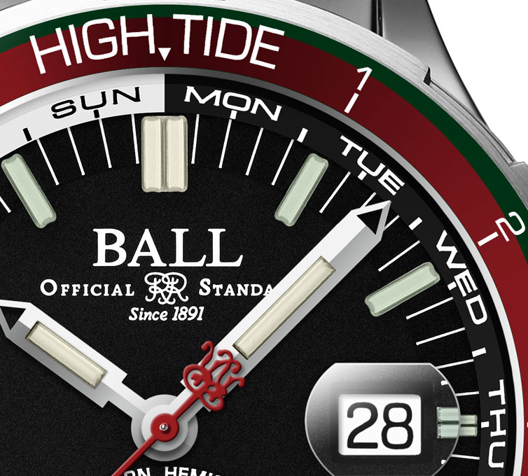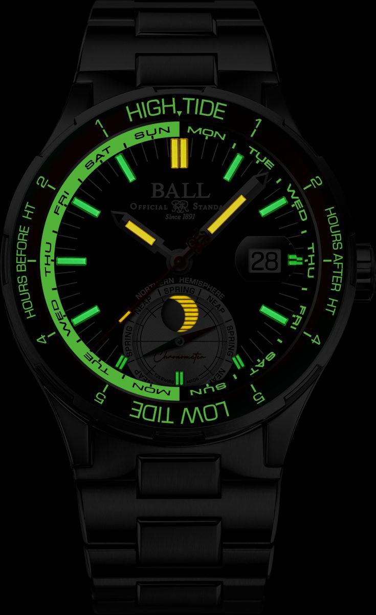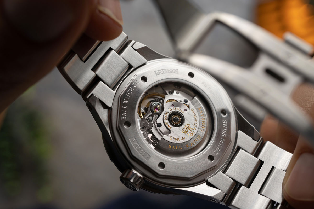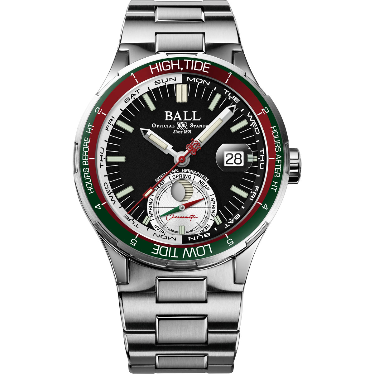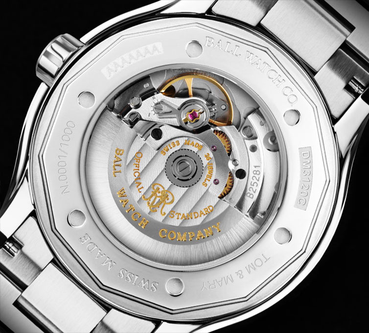 ムーブメントは自動巻きキャリバー「BALL RR1803-C」を搭載し、スイスC.O.S.C.認定クロノメーターとして高精度を保証する。ケースは41mm径の316Lステンレススチール製で、裏蓋はシースルーバック仕様。両方向回転式アルミニウムトップベゼルにはスーパールミノバ夜光を塗布し、100m防水性能を備える。世界限定1000本の稀少モデルである。